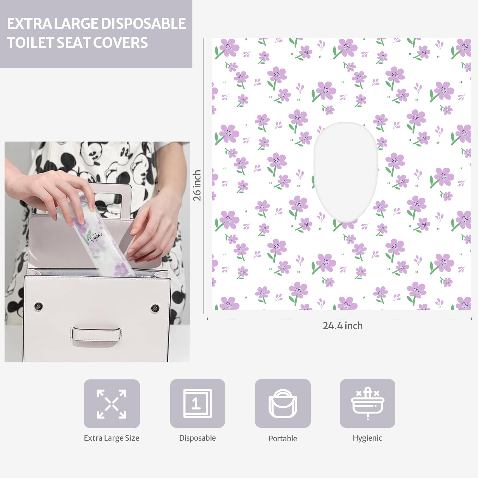 Extra Largeļ¼Our 26x24 inch extra-large disposable toilet seat covers suit for kids and adults, which can cover the entire seat sides and the front of the toilet in order to keep your legs or clothes from touching the nasty toilet. Waterproof: Disposable potty liners for toddlers are use 100% PE waterproof layer, effectively isolates mess in public toilet, and provides great protection, no longer worried about your kids touching nastiness on the seat. Portable: 10 packs total 20pcs, each individual pack contains 2 pcs toilet seat covers for travel, folded to handy size and easy to put in the wallet, handbag, pocket. No embarrassment wherever you take them. The perfect solution for your travel peace of mind. NON-SLIP ADHESIVE STRIPS: Our portable toilet seat cover is equipped with adhesive stickers on the back, which can be well adhered to the toilet ring, provide a stable and safe environment for children. It is especially suitable for training children to go to the toilet independently. Soft Touch: This kids toilet training seat covers are use soft non-woven fabric, soft and smooth, comfortable to the touch, and will not irritate children's delicate skin when touched, providing them with a soft feeling. Made of 2 layers materials. Soft-touch non wove on one side. PE Waterproof Liner on the Other Side. Non-slip design prevents it from slipping from the toilet seat. Size: approx. 26*24 inches/ 66*62cm. These toilet seat covers disposable travel pack are widely used: For hotels, hospitals when use a public toilet . Toddlers and kids potty training. Travel essentials for airplanes, public restrooms, public bathroom, outdoor campings, road trips, etc.