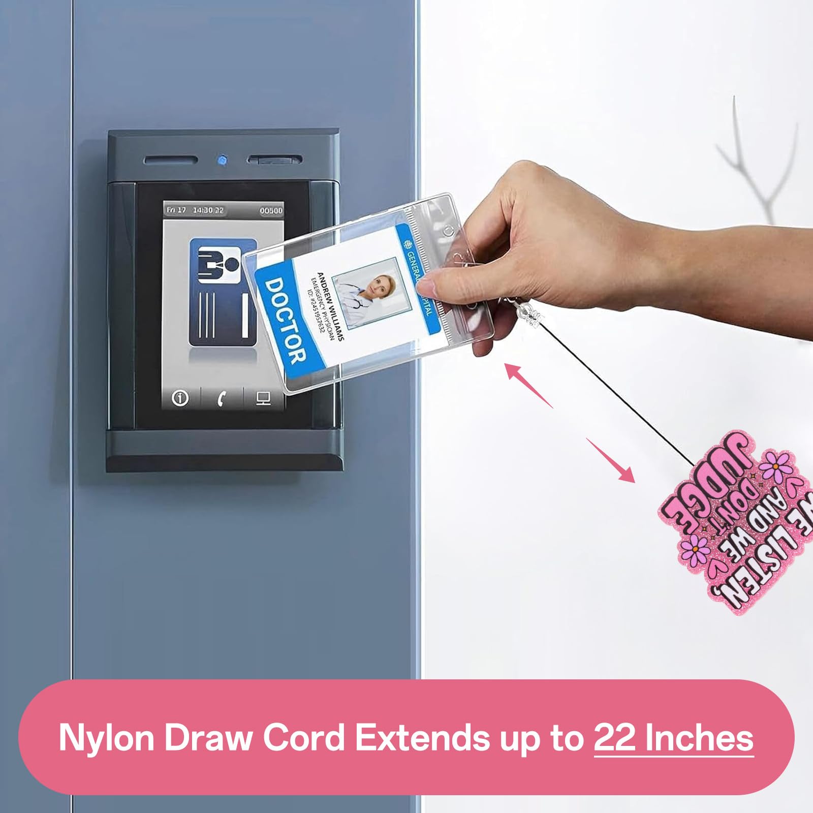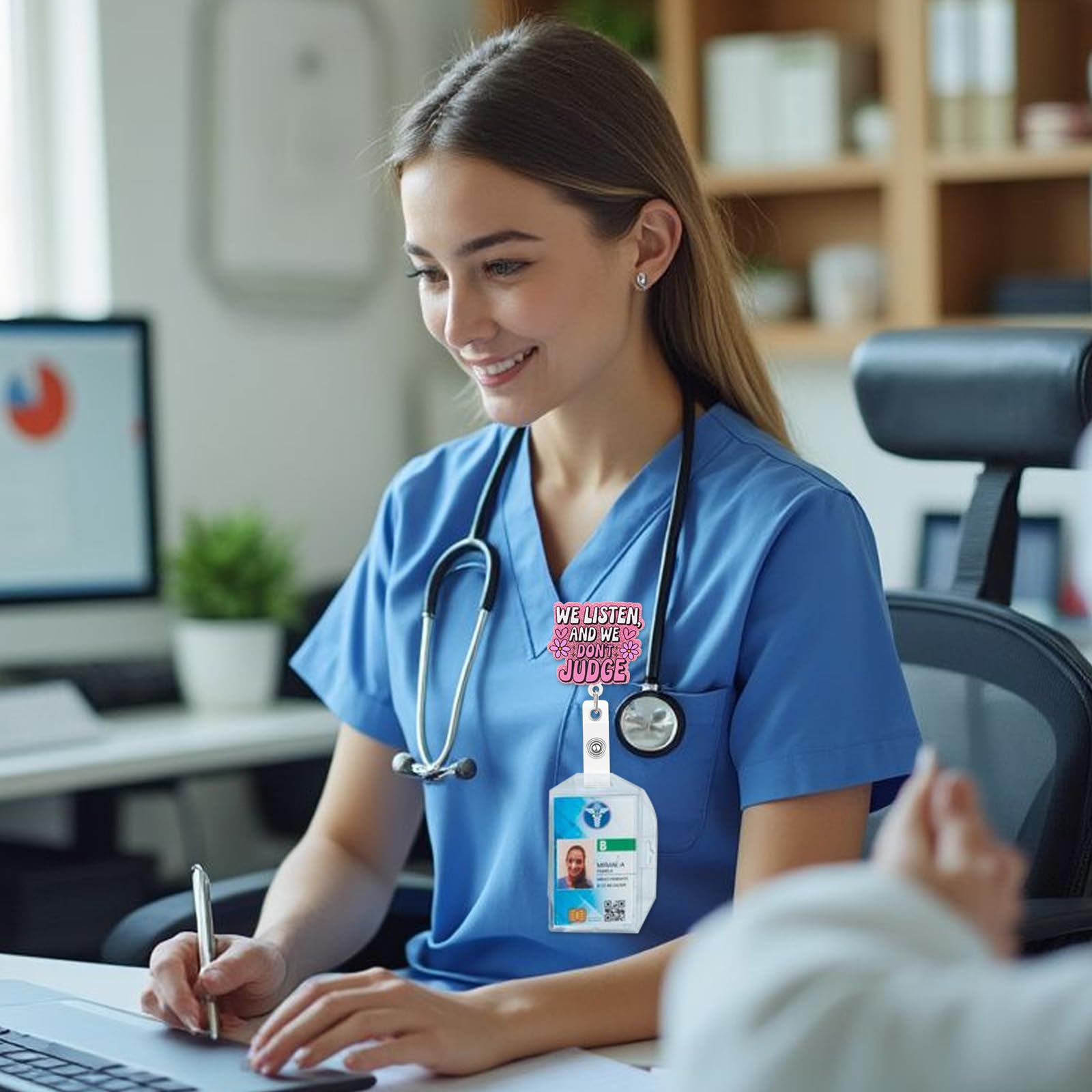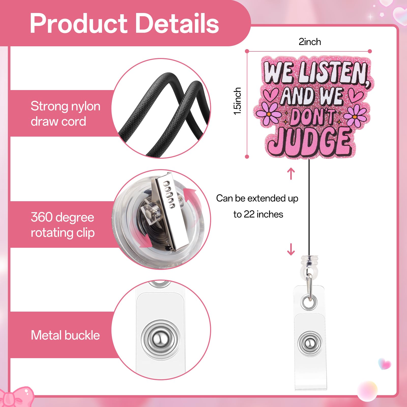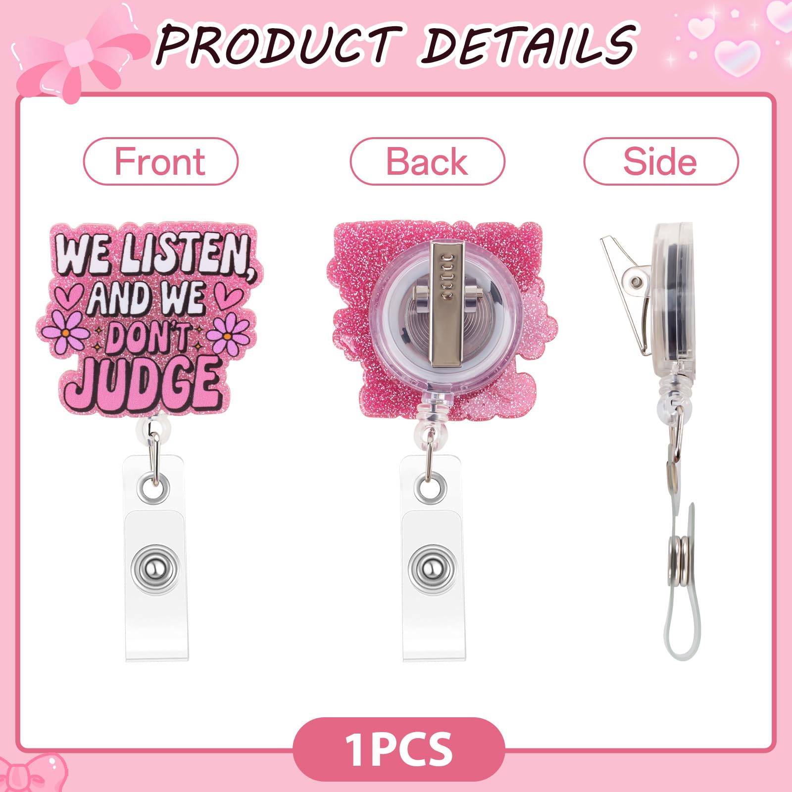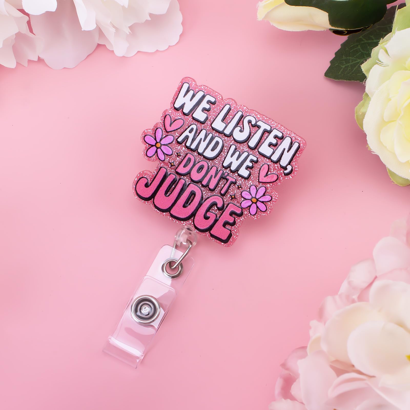 This fun and cute badge reel features the phrase "We Listen, We Don't Judge" and will add some personality and humor to your everyday work attire. Whether you're a nurse, counselor, therapist, or work in a profession that requires understanding and empathy, this badge reel is fun and meaningful. Its unique design makes it a perfect conversation starter and a great way to show off your sense of humor while maintaining your professionalism. A Fun and Quirky Accessory Who says work uniforms can't be fun? This badge reel is designed to bring some levity to your everyday life. The cheerful and uplifting phrase adds a personal touch to your uniform, making it stand out in the most charming way. Whether you're at a hospital, clinic, school, or office, this badge reel will ensure that your sense of humor and compassionate nature stand out. Not only is it practical, it's an extension of your personality! Durable and Long-Lasting This badge reel is made from high-quality, durable materials to withstand everyday use. The sturdy and durable construction ensures that the reel can be easily retracted, allowing you to use it effortlessly when scanning ID cards, swiping access cards, or presenting documents. The design is also durable, so the cute lettering won't fade over time. Perfect for a variety of professions Perfect for nurses, therapists, counselors, and healthcare workers, this badge scroll is perfect for anyone in a helping profession. It's a great way to remind your patients or clients that you listen and are supportive. But it's not just for healthcare workers - this charming badge scroll is also perfect for those working in customer service or any role where compassion is key. Perfect Gift Idea Looking for a unique and thoughtful gift for a coworker, friend, or loved one? This fun and cute badge scroll is perfect! Whether it's for a birthday, holiday, or just a special gift to brighten someone's day, it's an accessory they're sure to love and appreciate. It's a great way to make their day a little more fun while also giving them a practical, everyday item.