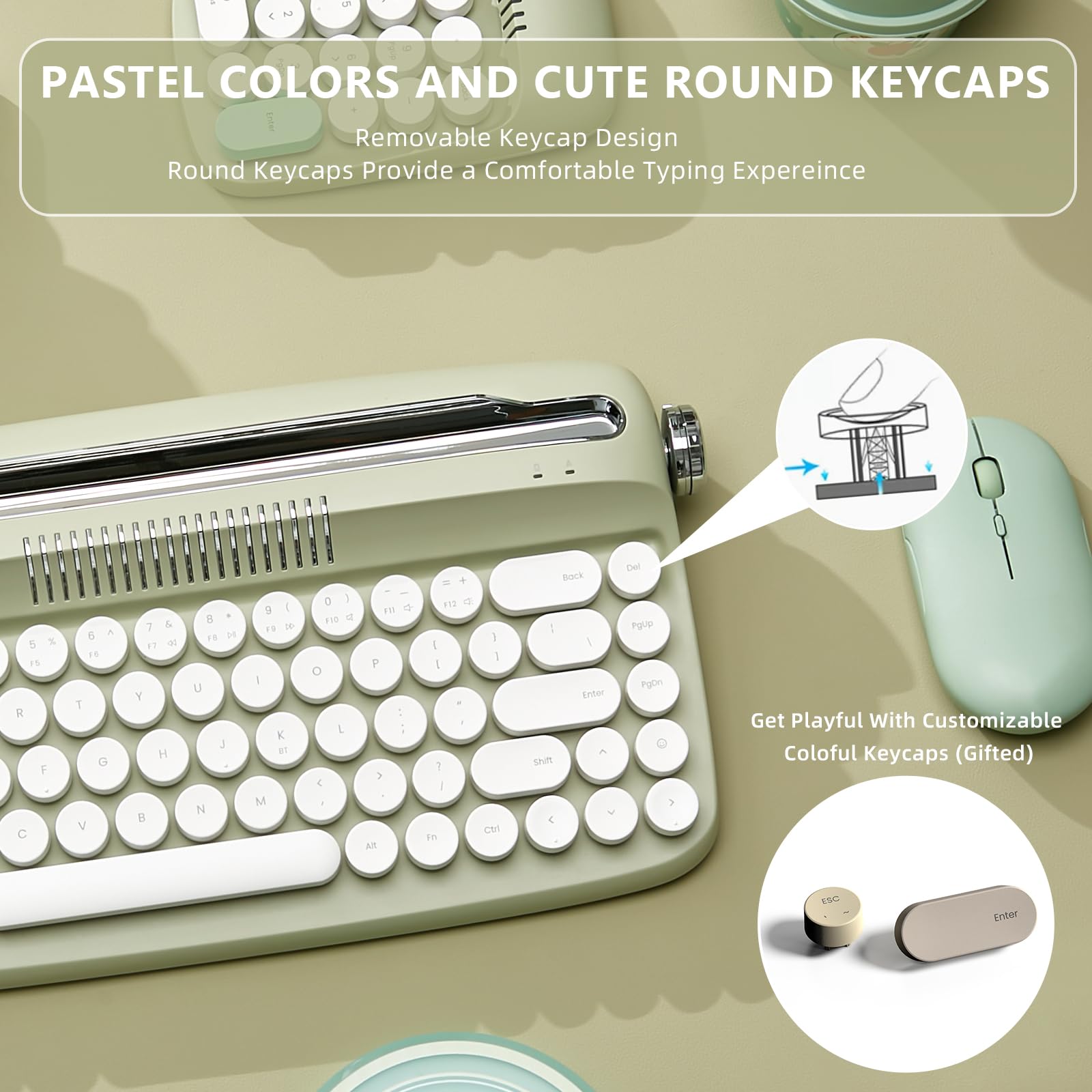 WIRELESS RETRO CUTE KEYBOARD:The YUNZII Upgraded wireless retro keyboard adds knob control, rechargeable battery and Bluetooth & wired connections. The colorful keyboard offers a unique blend of vintage charm and modern typewriter functional, with its compact layout, retro keyboard typewriter style, pastel colored keyboard with round keycaps. Bringing a more enjoyable typing experience with this aesthetic keyboard