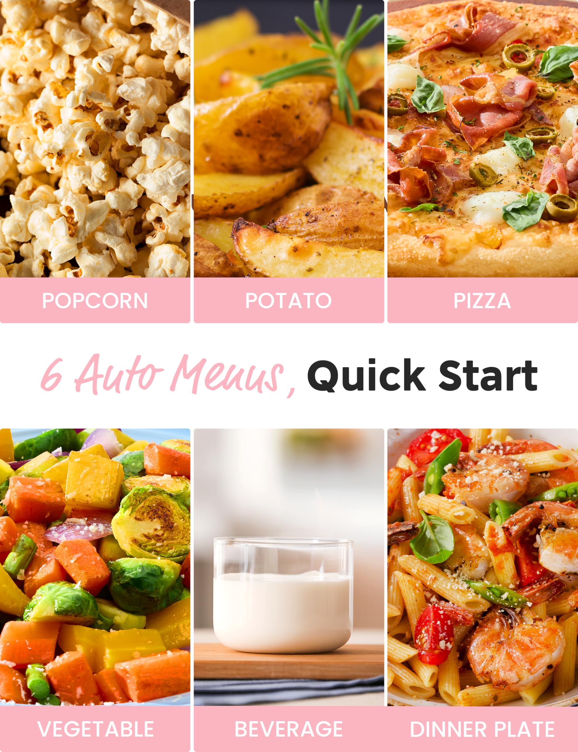 11 Power Cooking Level with 900w Output: This microwave has 6 auto menus, which can help you in your daily meals--popcorn, beverage, vegetable, meat, pizza, potato, pasta, soup, reheat.