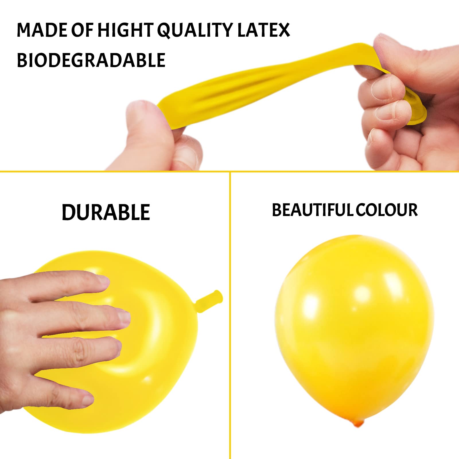 Thicker latex yellow balloon : These party balloons are made of thicker and safe natural latex material, durable, long-lasting and Eco-friendly, thick enough and safe to be used for both kids and adults.
