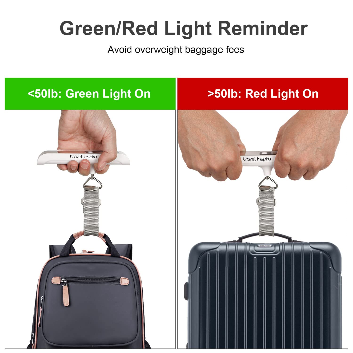 LCD DISPLAY & GREEN/RED LIGHT REMINDER - The handheld luggage scale adopts a clear and readable digital LCD display. GREEN/RED light reminds you if the baggage is overweight, preventing overweight baggage charges (Airline weight restriction: 50lb. <50lb: GREEN, >50lb: RED).