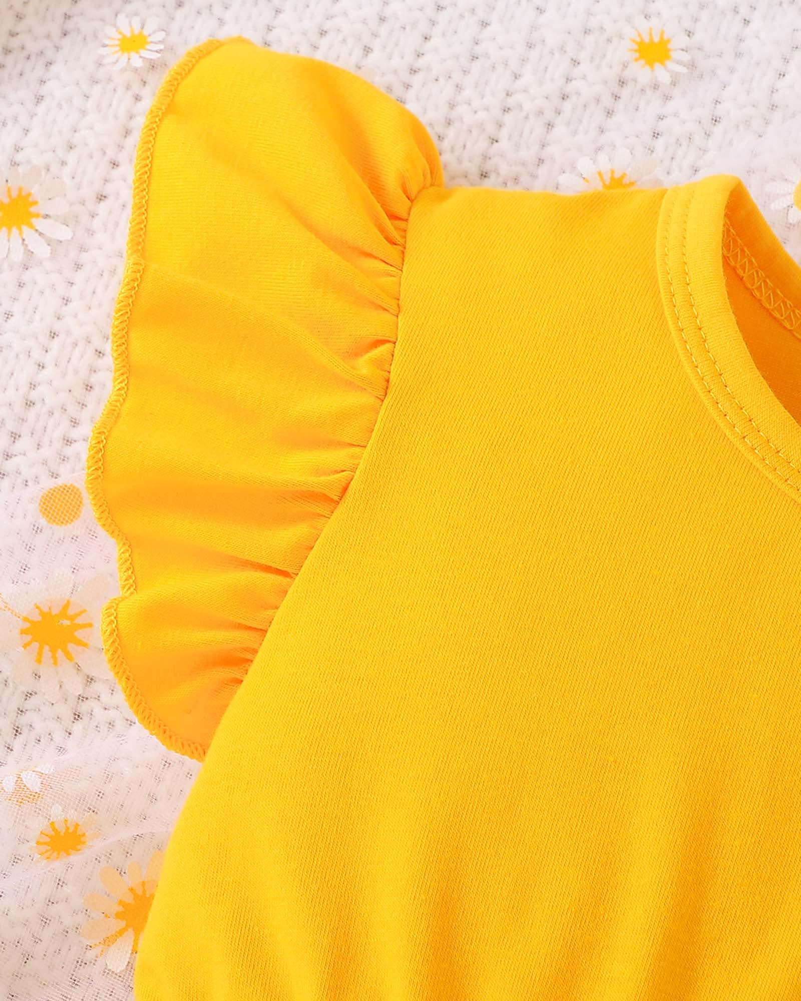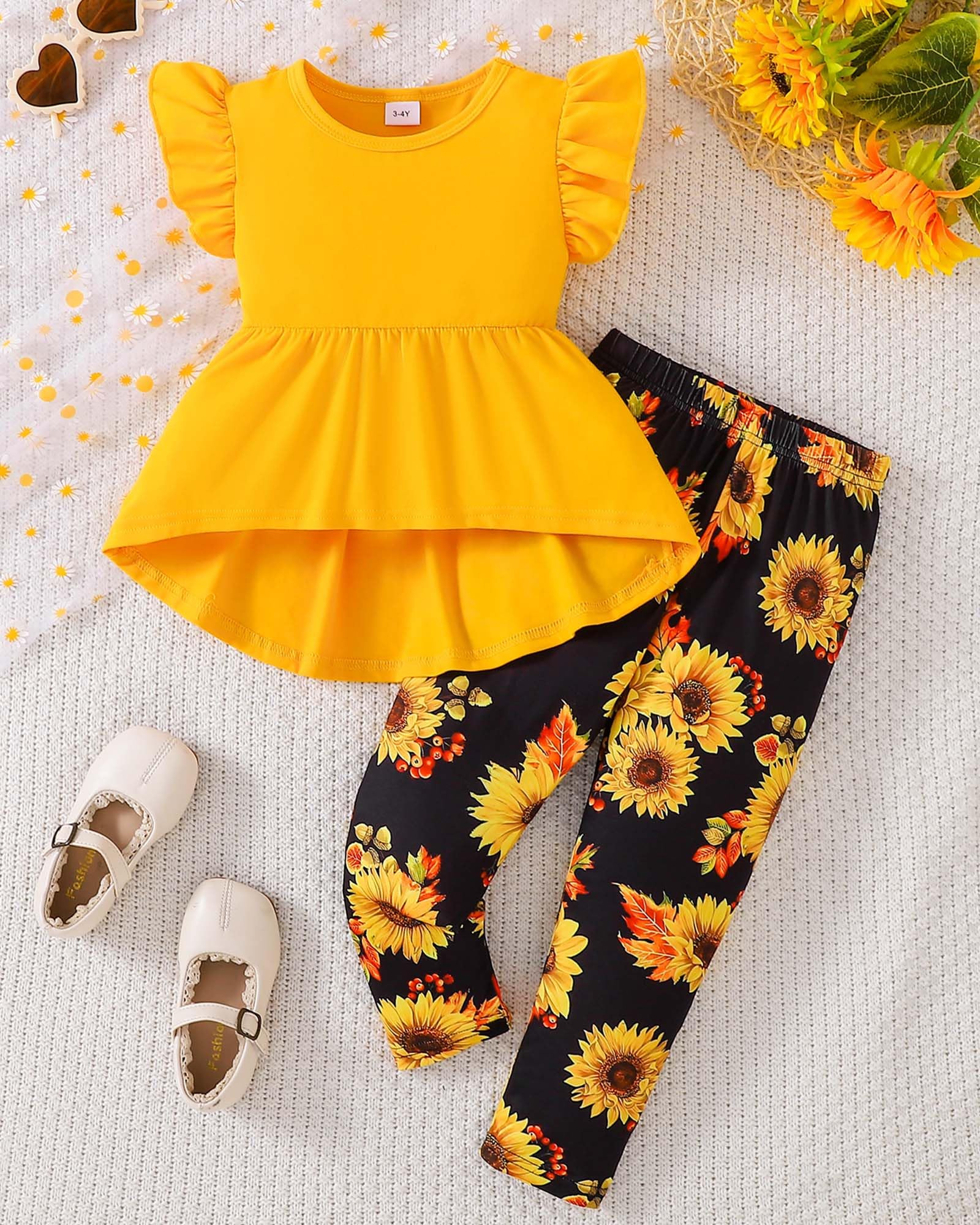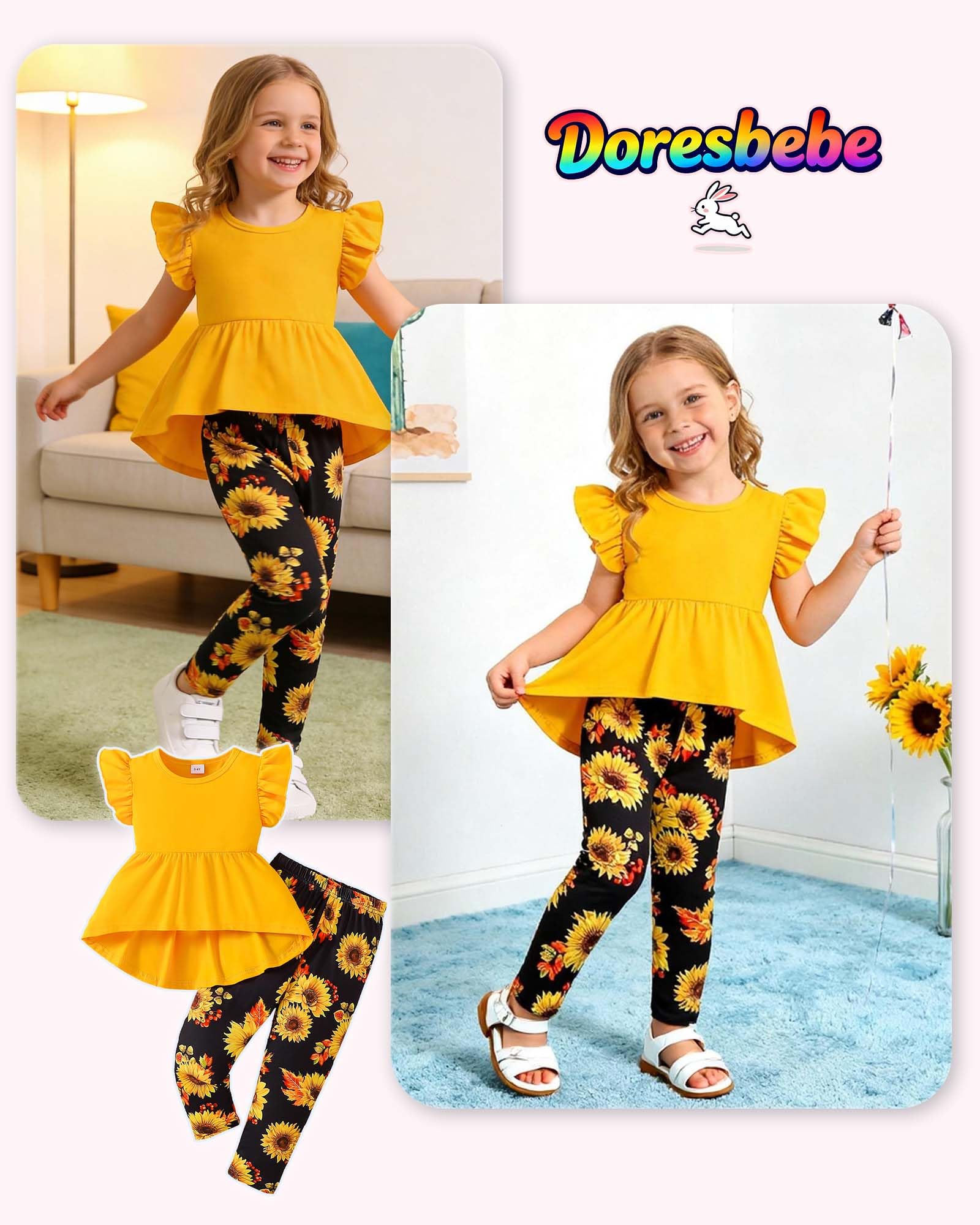 Stylish 2-Piece Outfits Design: This toddler set includes a ruffle sleeve shirt (with cute loose fit) and elastic waist pants, available in charming prints (floral, sunflower, butterfly) and vivid colors (pink, blue, yellow, rose-red).Irregular Skirt Hemline