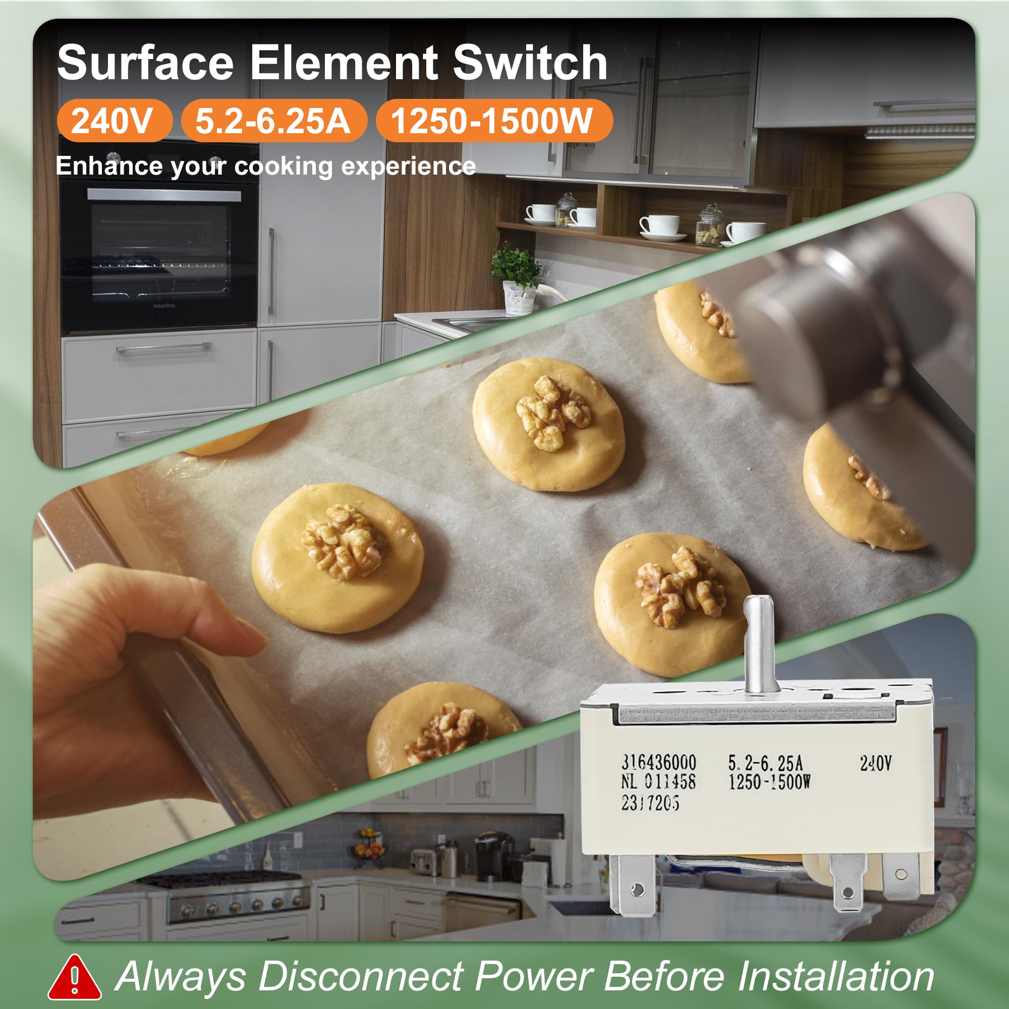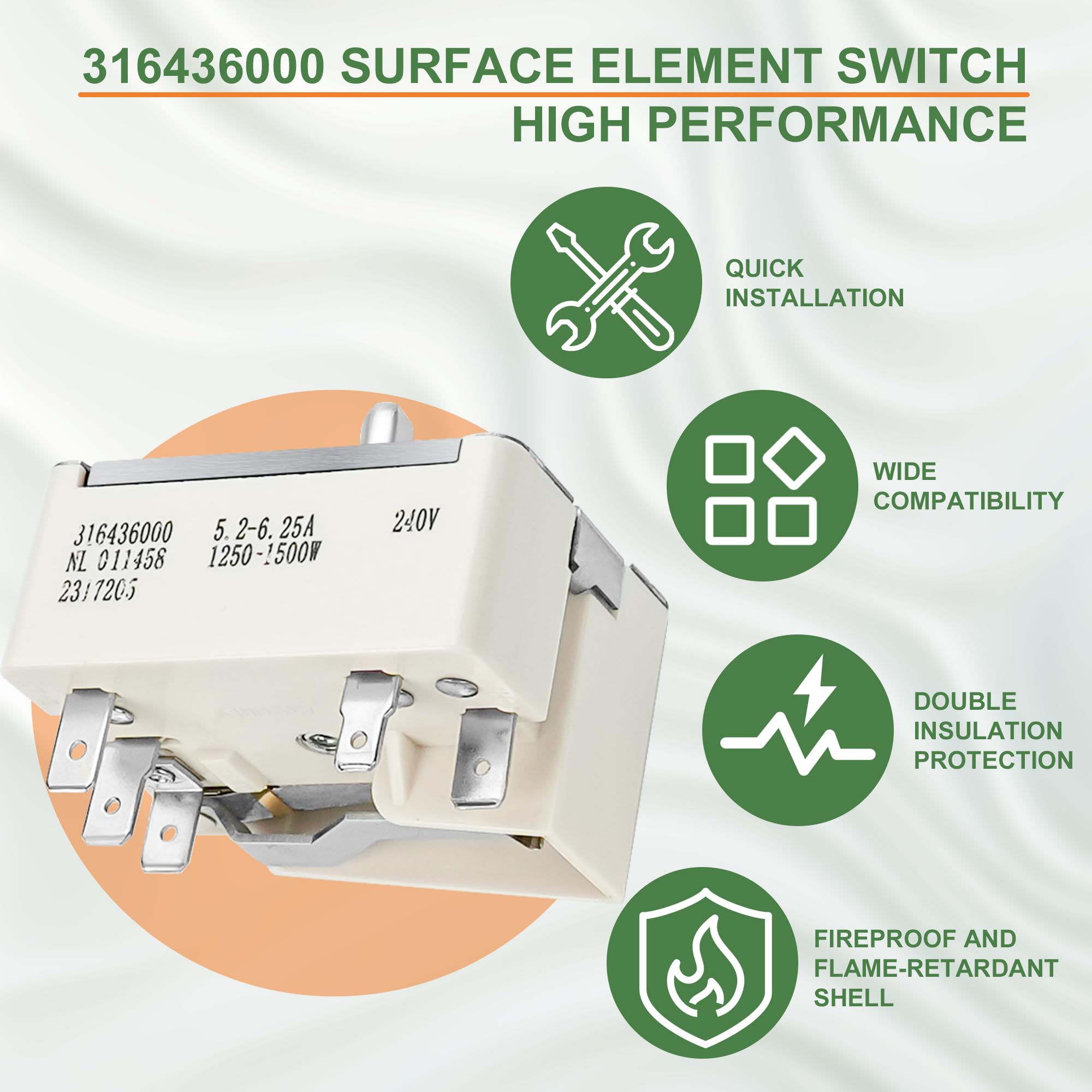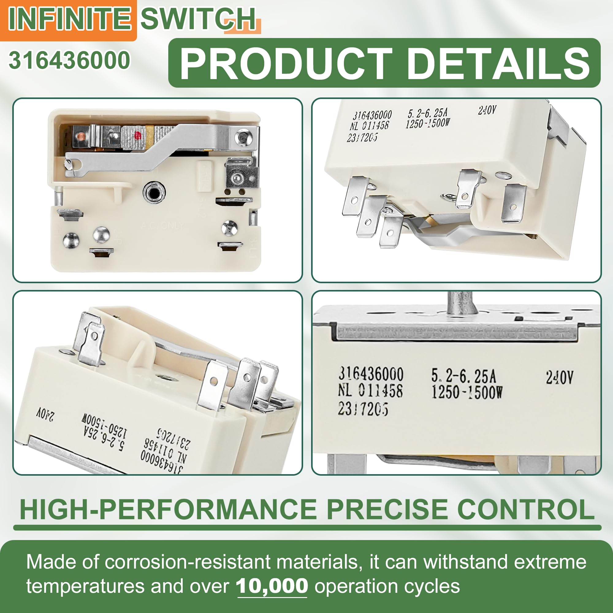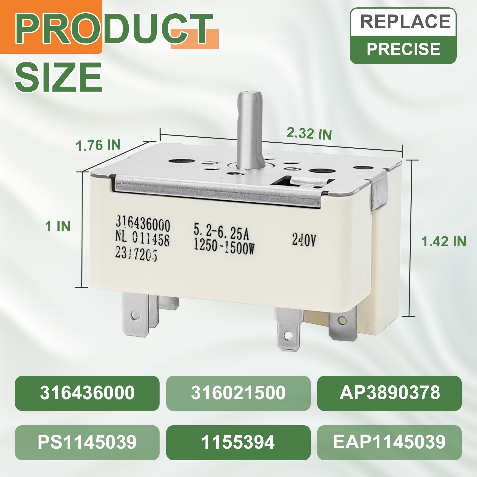 316436000 Infinite Switch: Technology with high-precision speed regulation (±0.5% accuracy), ensuring smooth temperature adjustments from low simmer to high heat. Perfect for 6" surface burners on 240V electric ranges (1250-1500W, 5.2-6.25A). Replace 316021500 AP3890378 PS1145039 1155394 EAP1145039 Electric Range Surface Burner Control Switch