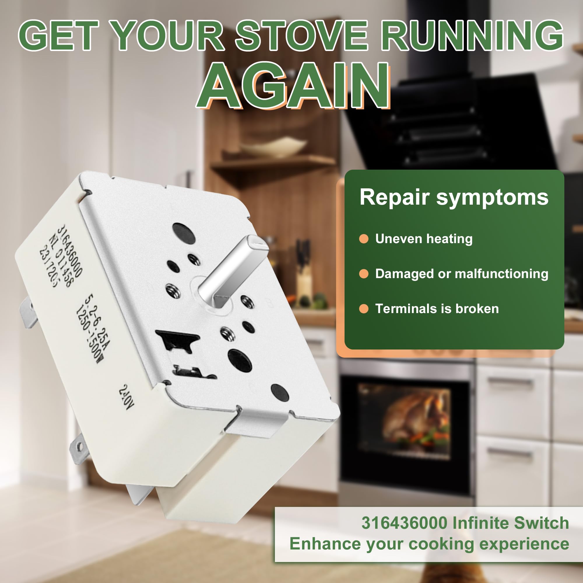 Durable Construction: Infinite Switch Small Element 316436000 Crafted with premium-grade materials and corrosion-resistant components, this infinite switch for electric stove withstands frequent use and extreme temperatures. Rigorously tested for 10,000+ cycles, it outperforms standard switches in durability, reducing replacement frequency