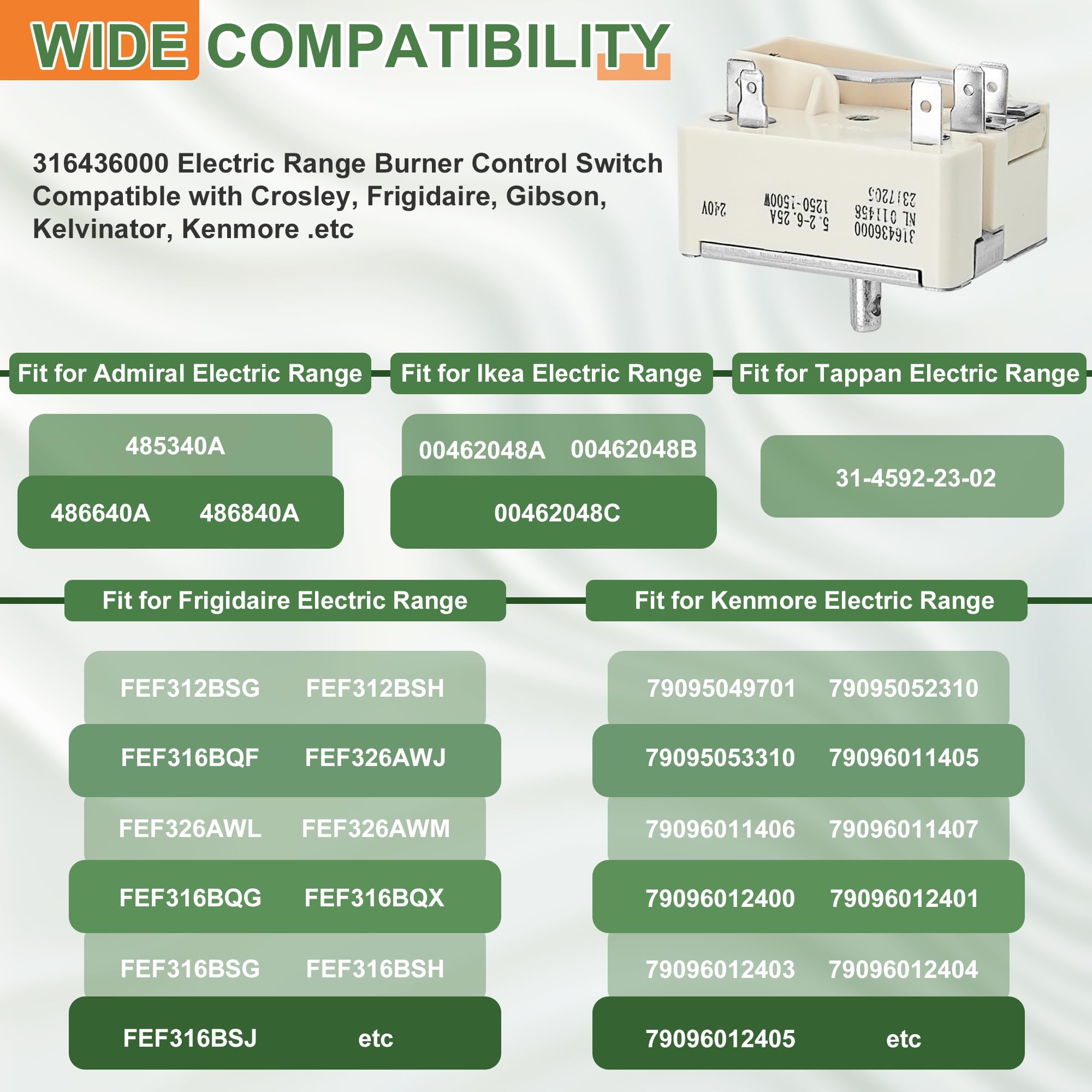 Wide Compatibility: 316436000 Electric Range Burner Control Switche Compatible with Cros ley, Frigi daire, Gib son, Kelvi nator, Ken more and other popular brands Model such as: 790.90112013, 790.90212012, 790.91062601, 790.94102700, 790.94102702, 790.94102703, 790.95032503, CWEF310GSG, FFEF3003NWA, FFEF3011LBD (please see FITS MODELS below for a complete list)