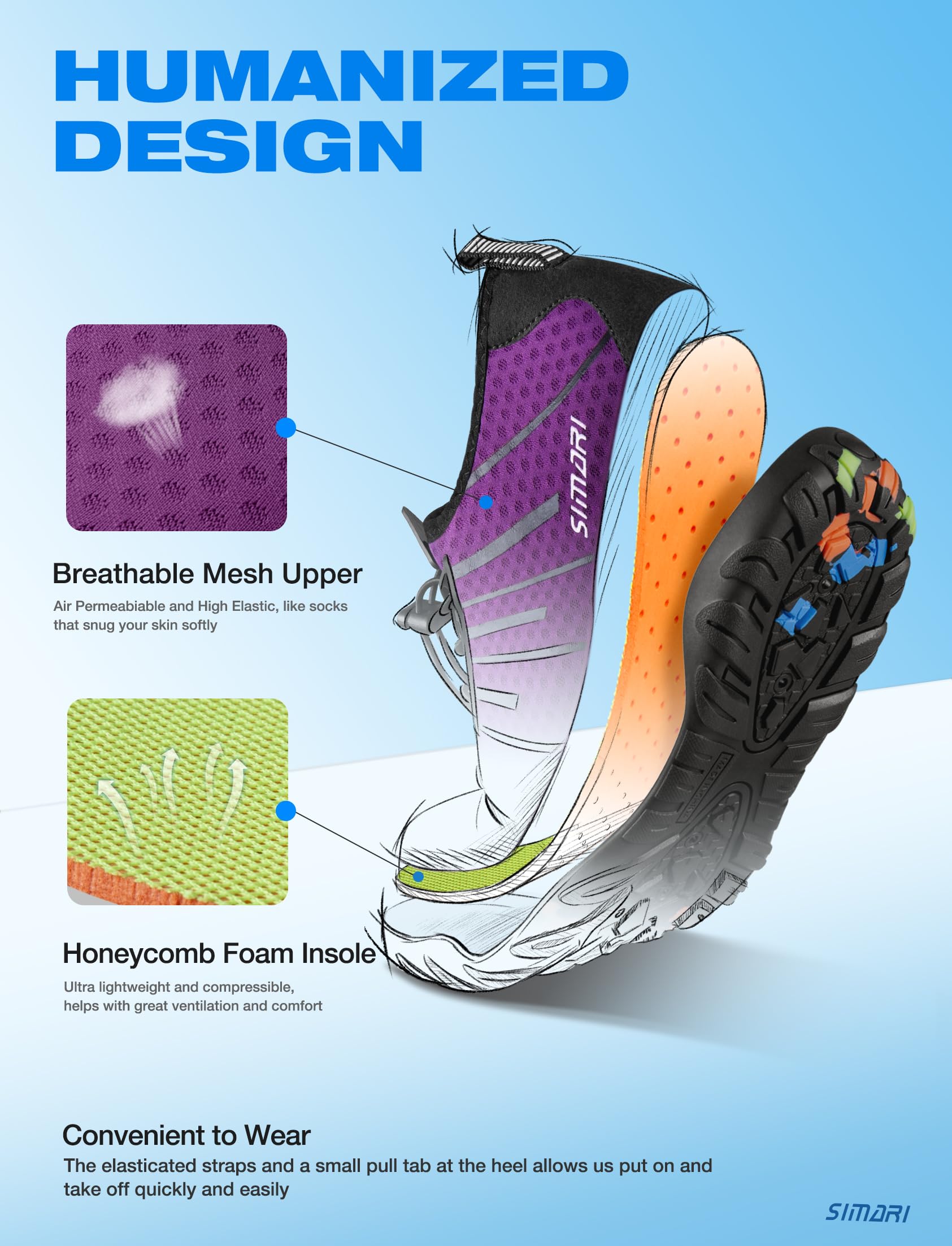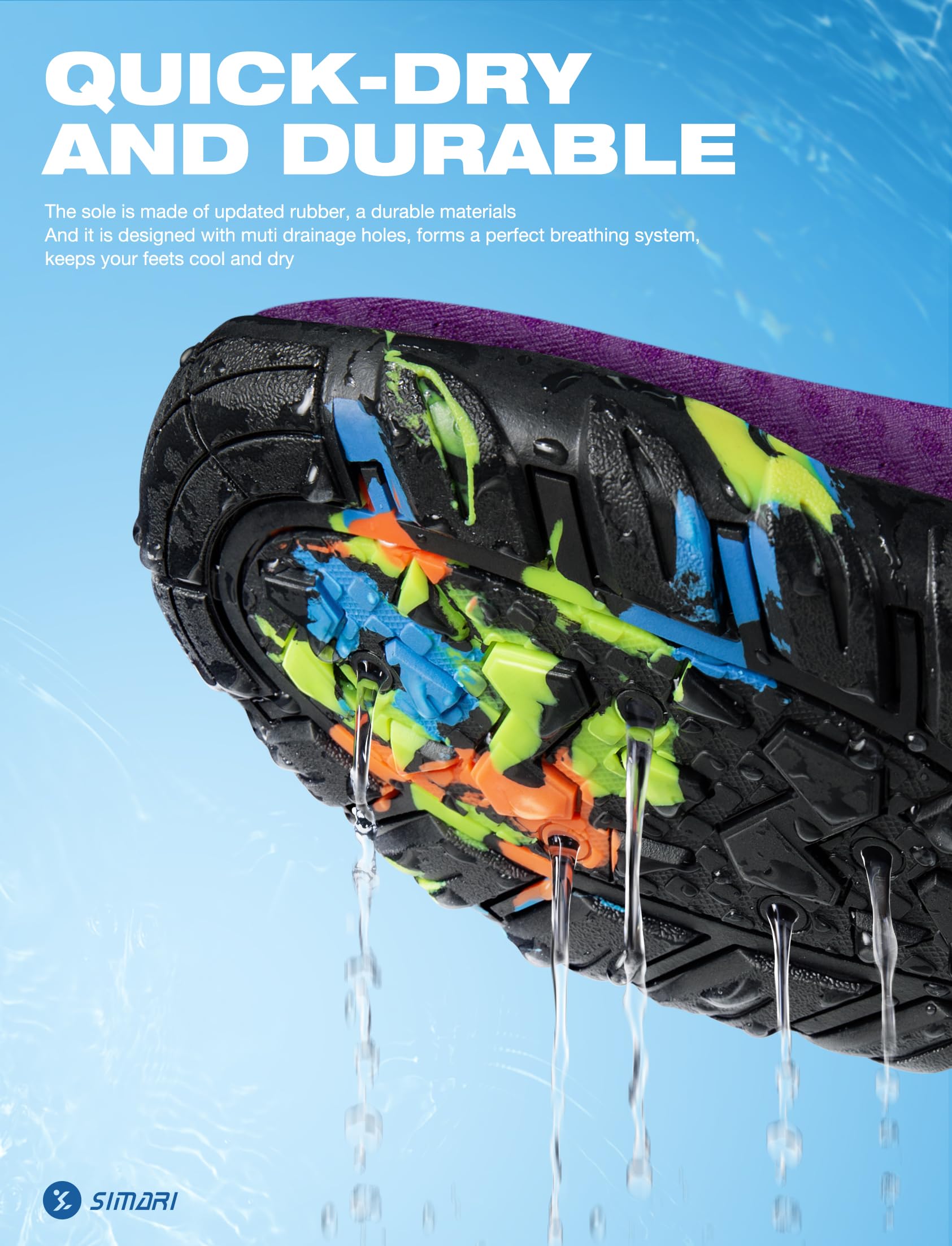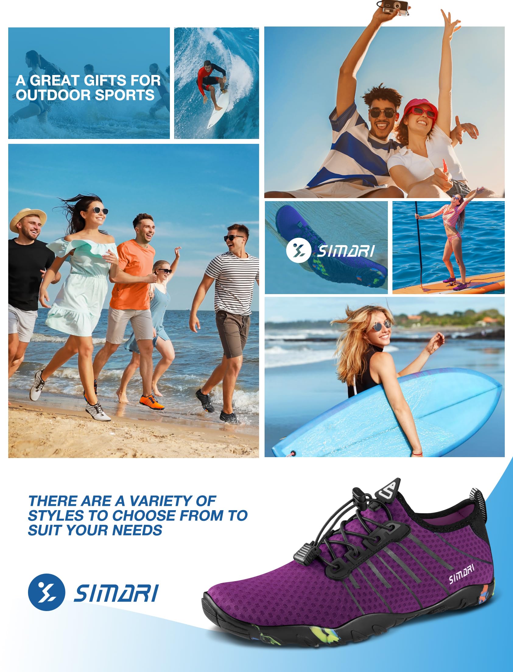 Description SIMARI WATER SHOES Are you looking for outstanding and comfortable water shoes for the beach trip? We offer you different colours to choose from. We also have many different styles and designs! We are sure that you will find something you like in our shop. Introduction of SIMARI water shoes: The soles are made of Ruber materials with excellent air permeability and good slip resistance. And the upper material is made of breathable and elastic mesh material with good breathability and quick drying. Unique sole design, ergonomically designed, provides great traction for all surfaces, unlike other shoes, shock absorbing performance cushioning separate from protective toes. Fast draining and cross ventilation, provides excellent flexibility and comfort to make you feel free and comfortable when wearing. Easy to carry when you go on holiday, water sports, diving, water park, water aerobics classes, rafting, through the waterfall, driving, car washing, etc. Note: Please rinse with clean water, store in a ventilated place to dry. Do not place it on the fire to dry it. Roasting may cause the shoes to come out of the shape and wire side.