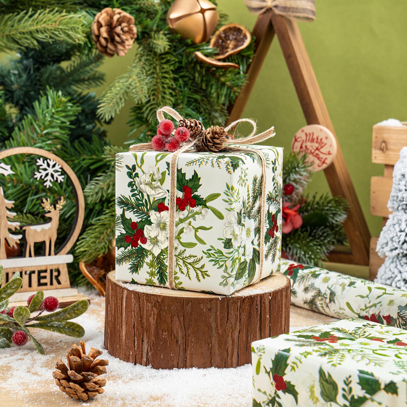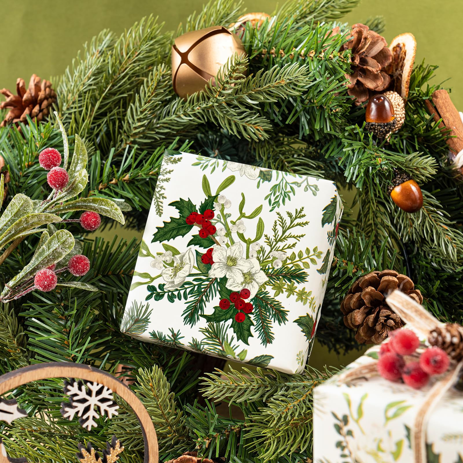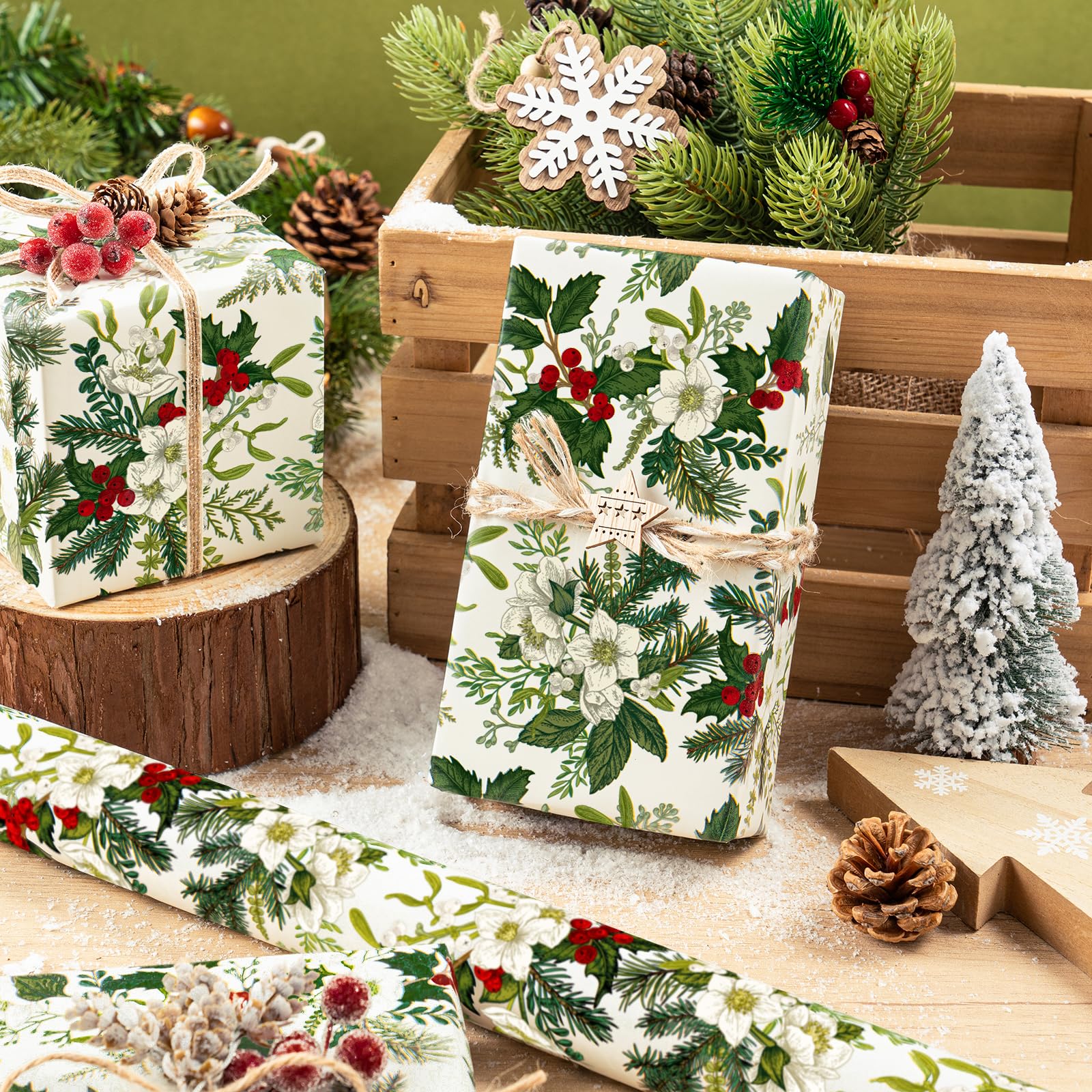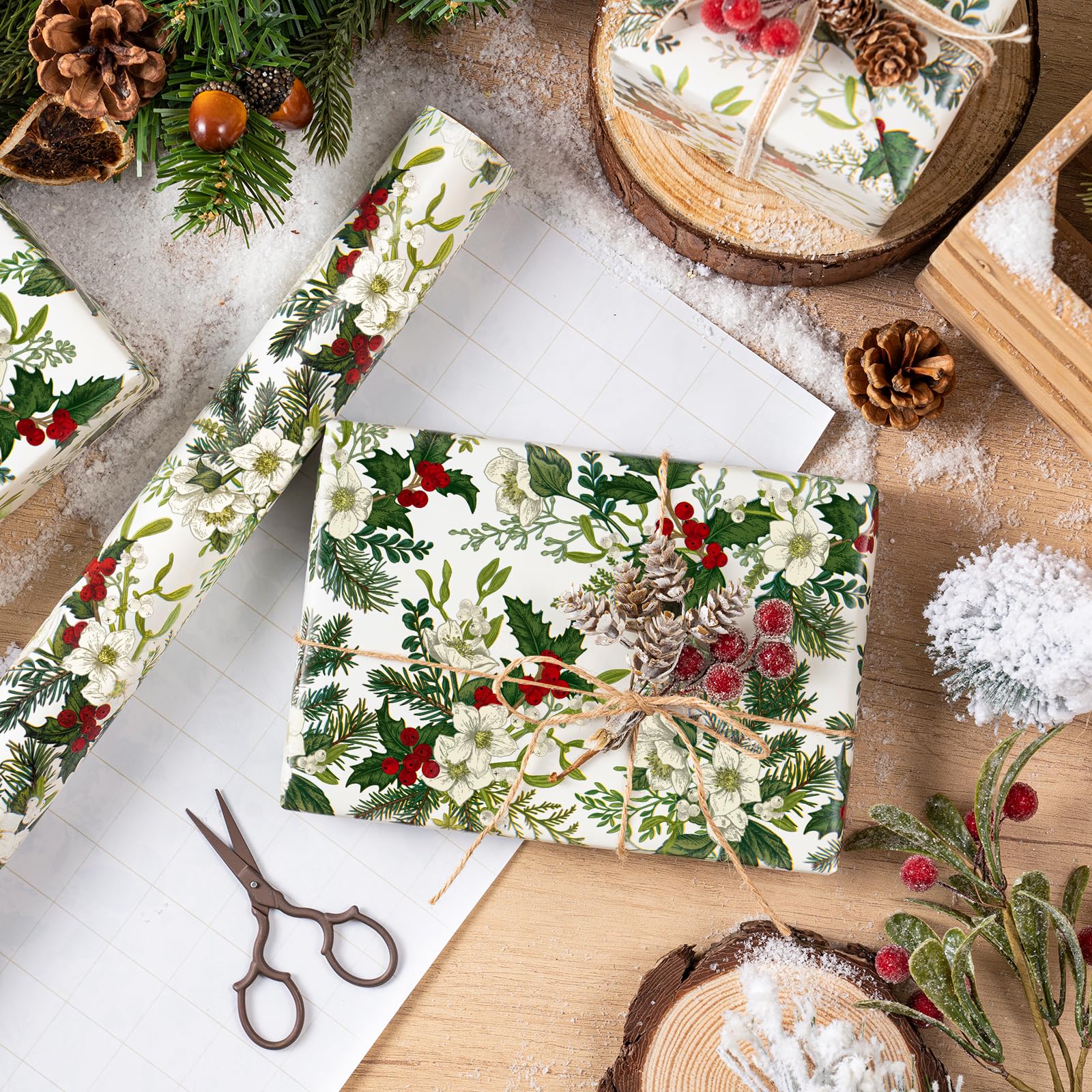 Christmas Design: White flowers, rich green leaves, and red berries printed on beige wrapping paper, creating a elegant and warm festive atmosphere. It will make your gift - wrapping more textured, stylish, yet special.