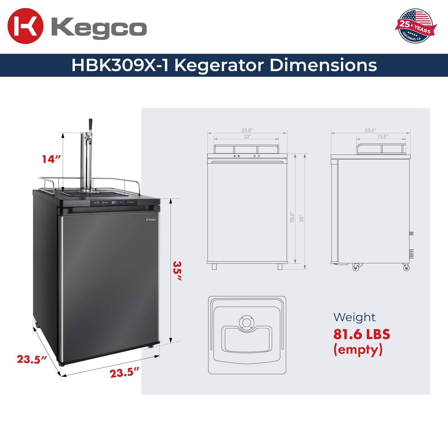 Serve your guests home brewed beer from Kegco's stylish high-quality HBK309X-1 Homebrew Kegerator! Specially designed for home-brewers, this kegerator features a complete ball lock keg dispense system that will allow you to tap one ball lock home-brew beer keg. It also has all of the same high quality features you've come to love from other Kegco kegerators and exciting upgrades like a stainless steel draft beer tower, commercial grade double gauge regulator, and glossy red 5 lb. aluminum CO2 cylinder. The Kegco HBK309X-1 has been designed with a matte black cabinet and a sleek black stainless steel door for a modern look that complements any decor. Black stainless steel is a unique black-graphite tone that resists more smudges, fingerprints, water spots, and streaks than standard stainless steel. Most stainless steel surfaces do not have a fingerprint-resistant finish and will need special polish to keep them looking new. With black stainless steel, cleaning is easy without any special polish requirements - simply clean with a damp cloth followed by a soft towel. PLEASE NOTE: This is a homebrew kegerator and includes ball lock keg couplers for home brew kegs; it will not tap commercial D system kegs.