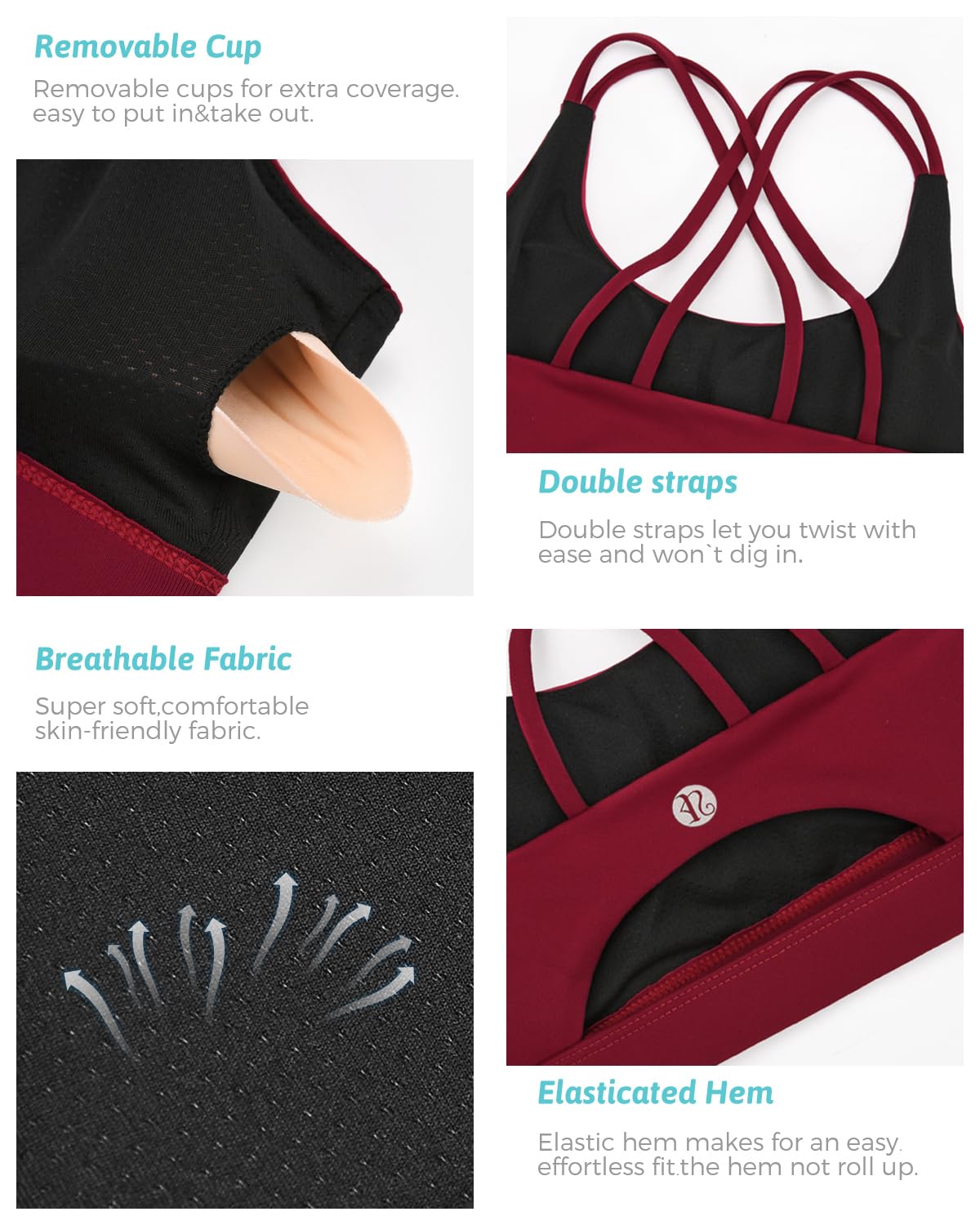 √YOUR SECURE FIT - Strappy design meets sporty style. Super soft scoop neckline with light, removable pads. Open cutout back styling sports bras for women medium support, widen band underneath the breast ensures a tight secure fit. Removable cups for extra coverage. The removable vertical cotton bra pads are easy to clean.The padded sports bra which always retains its shape and prevent bra bulges, caresses your figure to adjust to your curves.
