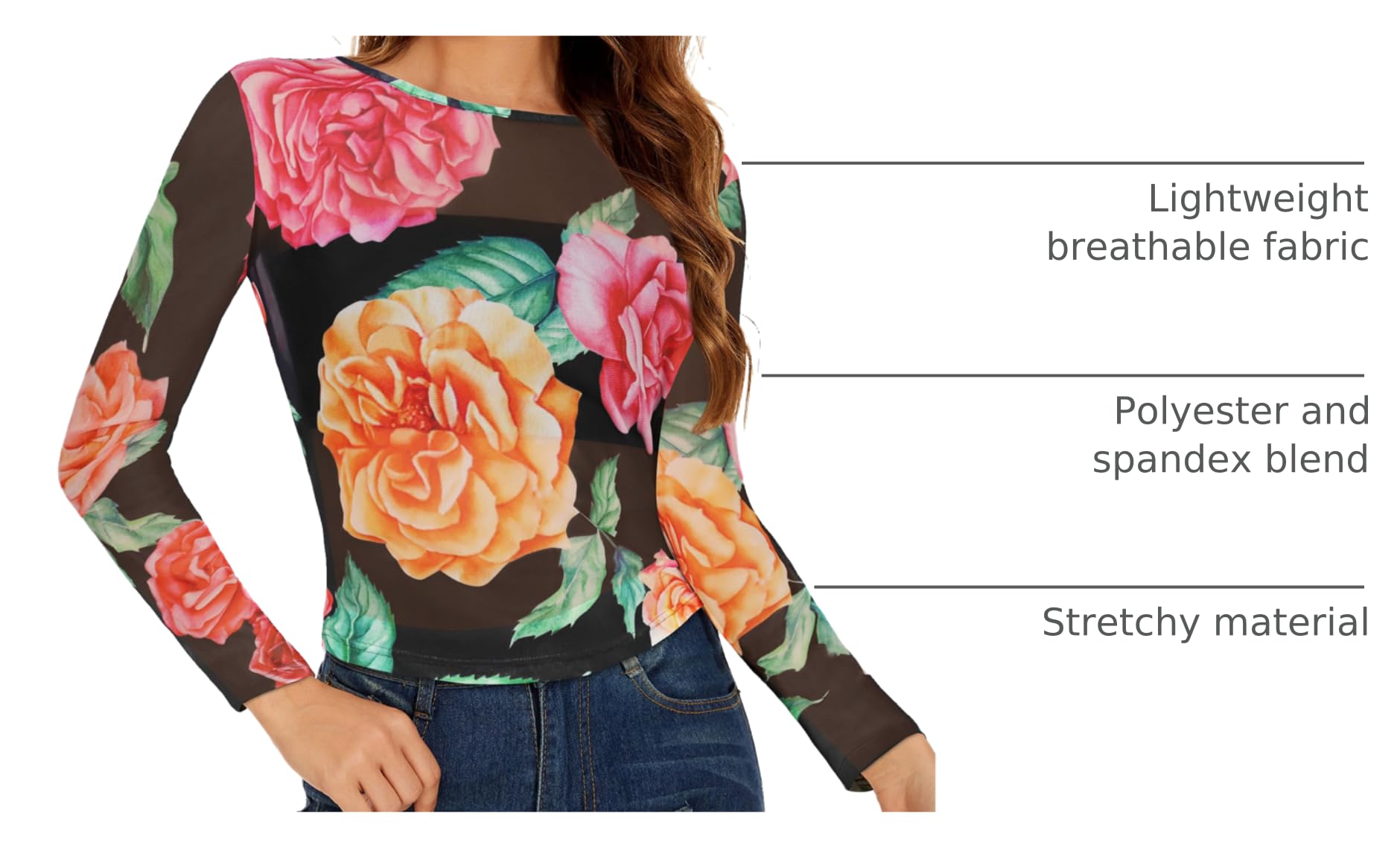 Feature: Mesh top, Floral print, See through, Stretch tee, Long sleeves, Round neck, slim fit, sheer tops can enhance the fashion sense of your outfit.