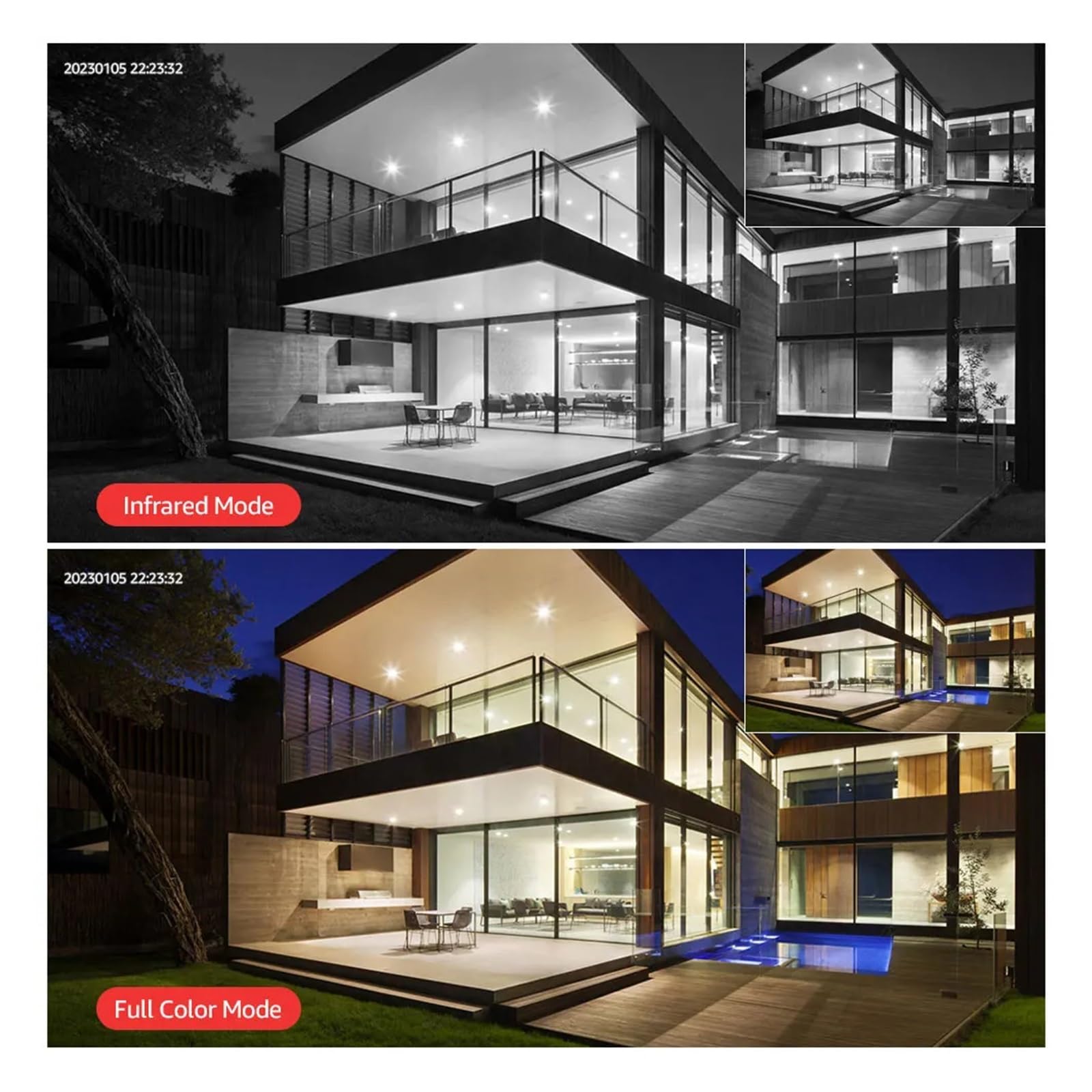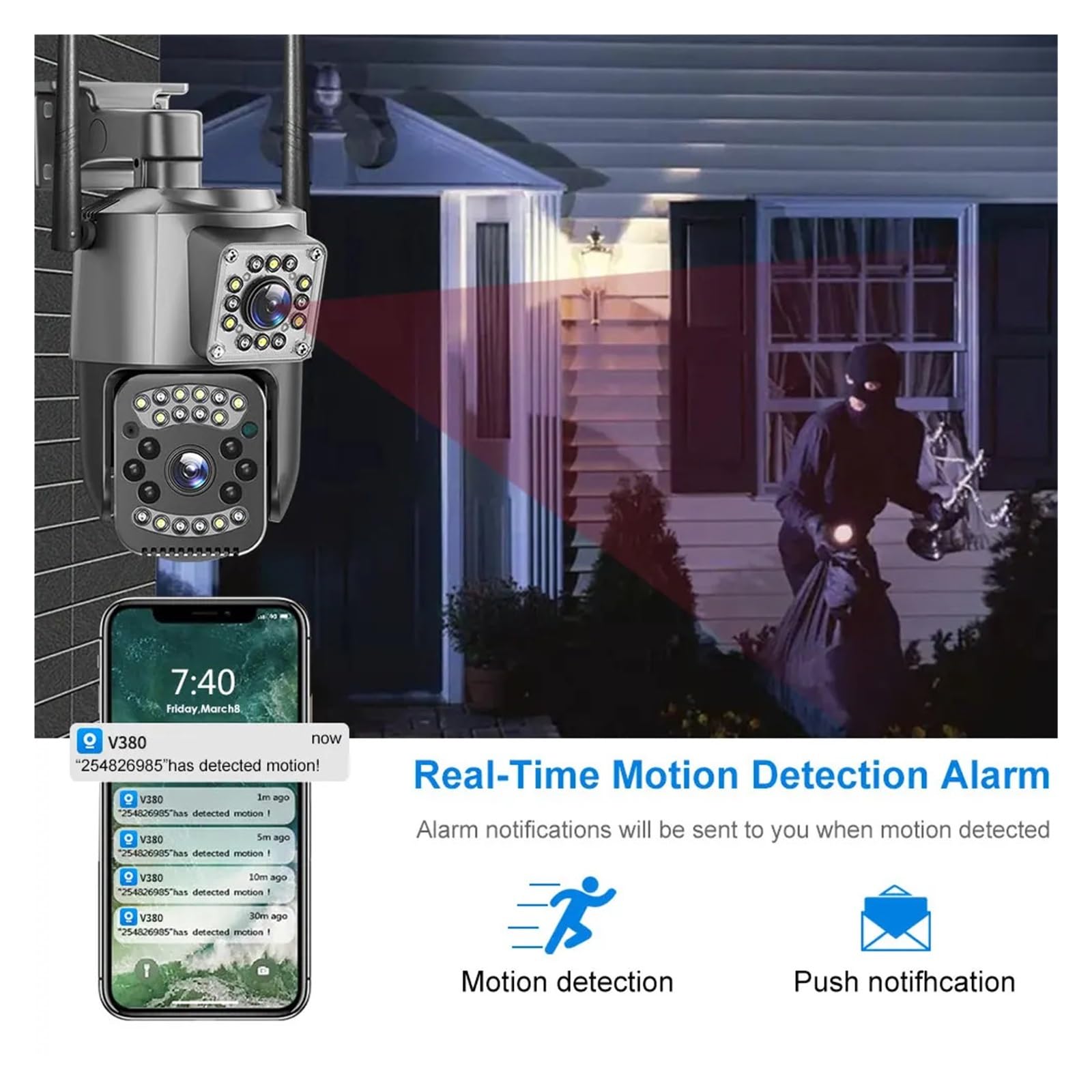【Full-color night vision + intelligent alarm, round-the-clock protection without slackening】: Equipped with red and white lights, it can switch between full-color / red light night vision modes, presenting clear and vivid night images; AI human shape detection accurately identifies anomalies, sending real-time alerts and automatically recording videos, enabling early detection of potential safety hazards.