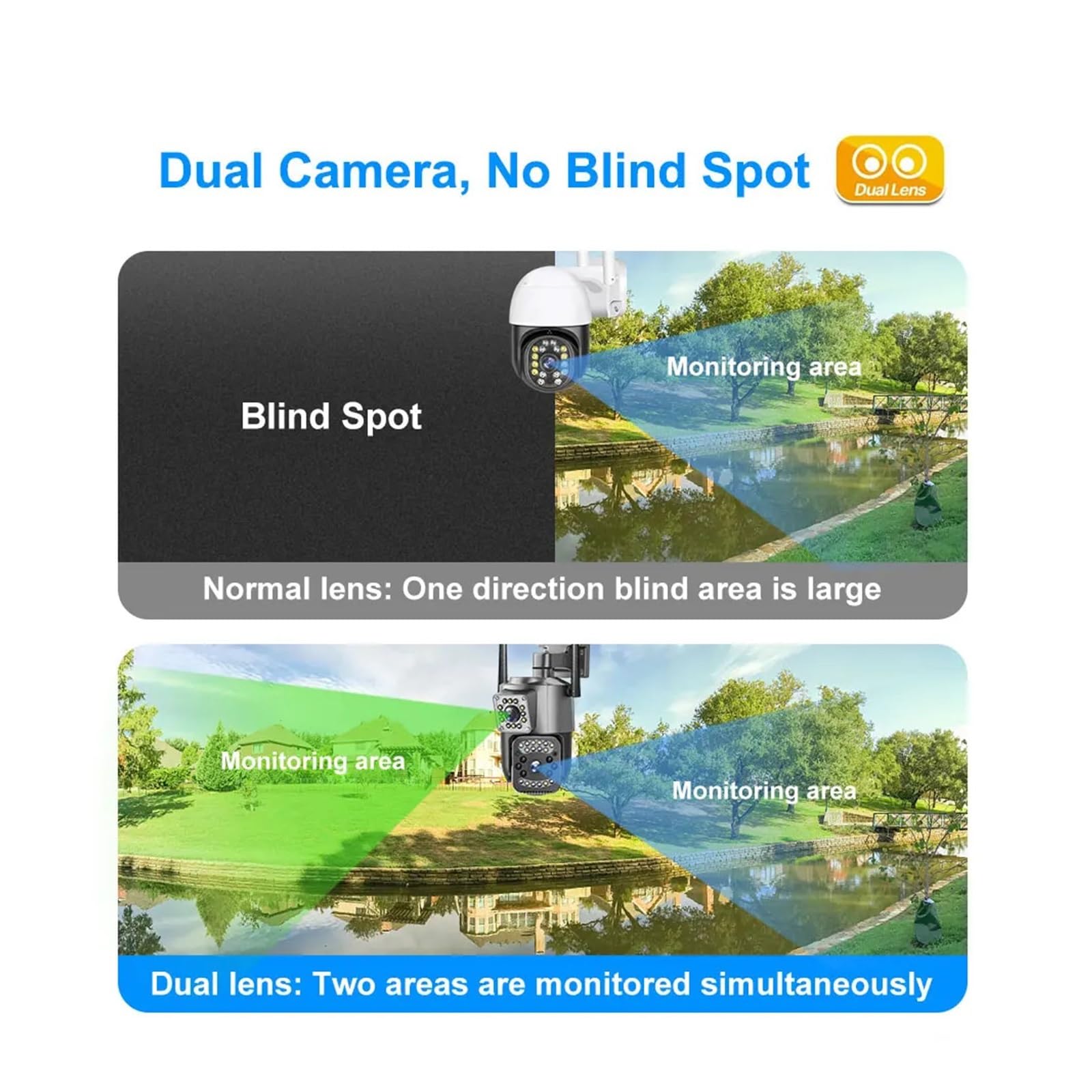 【Dual-lens dual-screen, all-in-one for both close and distant monitoring】: Available in 4MP/8MP specifications (2MP+2MP, 4MP+4MP combinations), featuring a 3.6MM wide-angle lens and a 4MM telephoto lens, with dual screens for synchronized display. Panoramic views of the close-up and detailed views of the distant areas are presented simultaneously, allowing for multi-area monitoring with just one device.