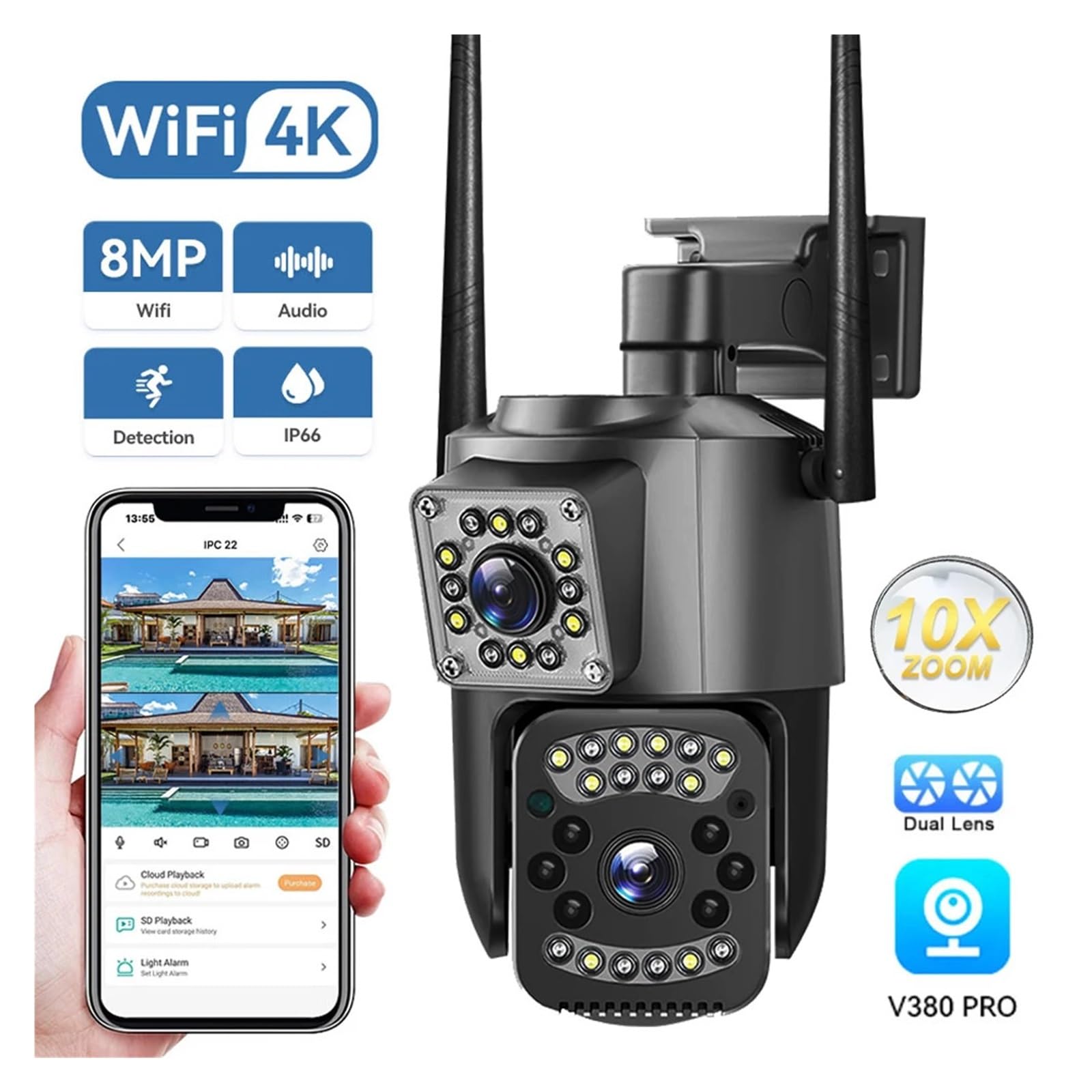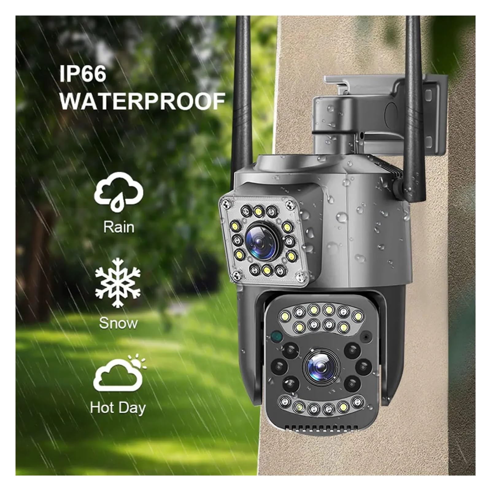 【Dual connection methods + IP66 waterproof, adaptable for various installation scenarios】: Supports 2.4G WiFi and wired network interfaces for dual-mode networking, making installation more flexible; IP66-level waterproof and dustproof design, unafraid of rain, sun exposure, and suitable for outdoor courtyards, warehouses, and other scenarios for stable use.