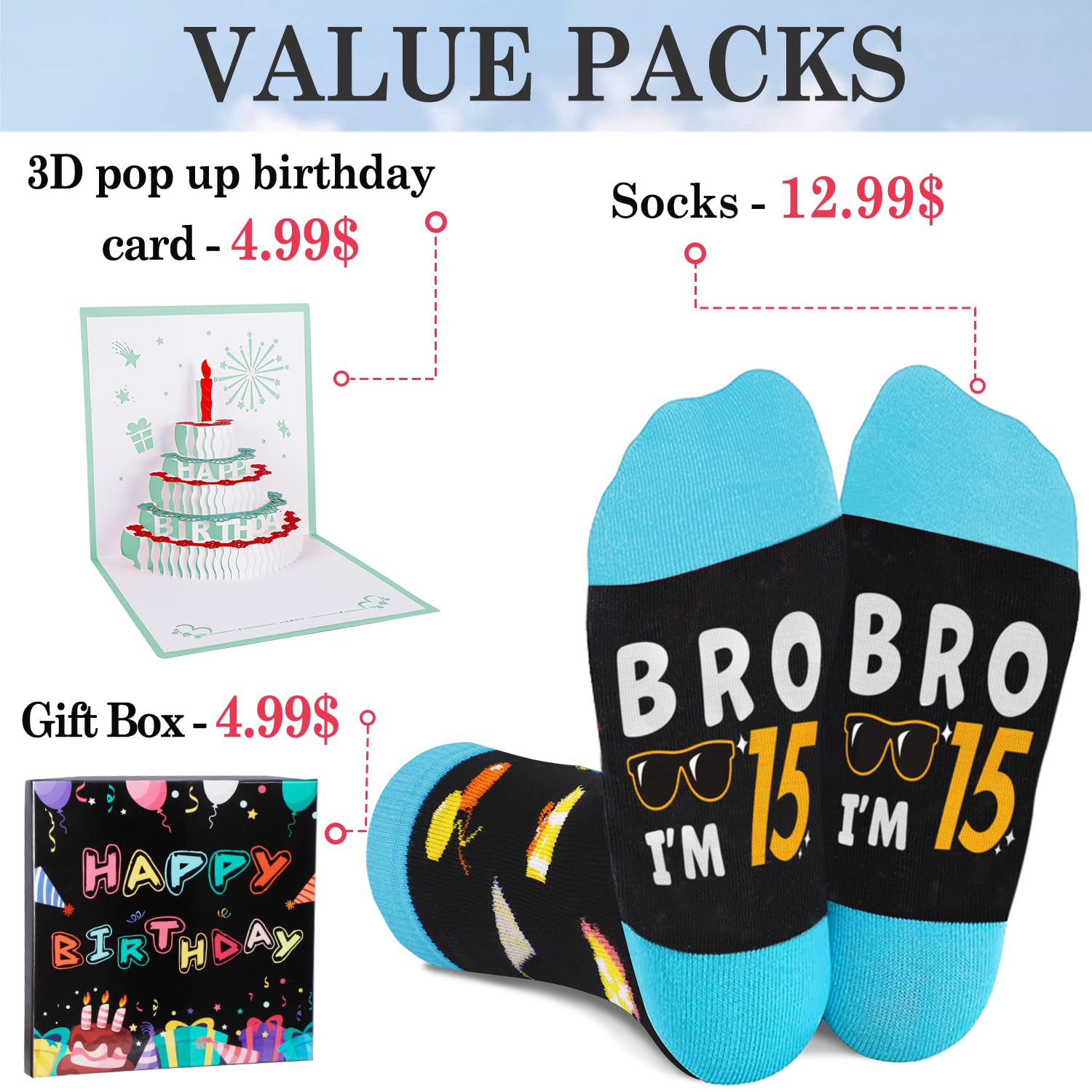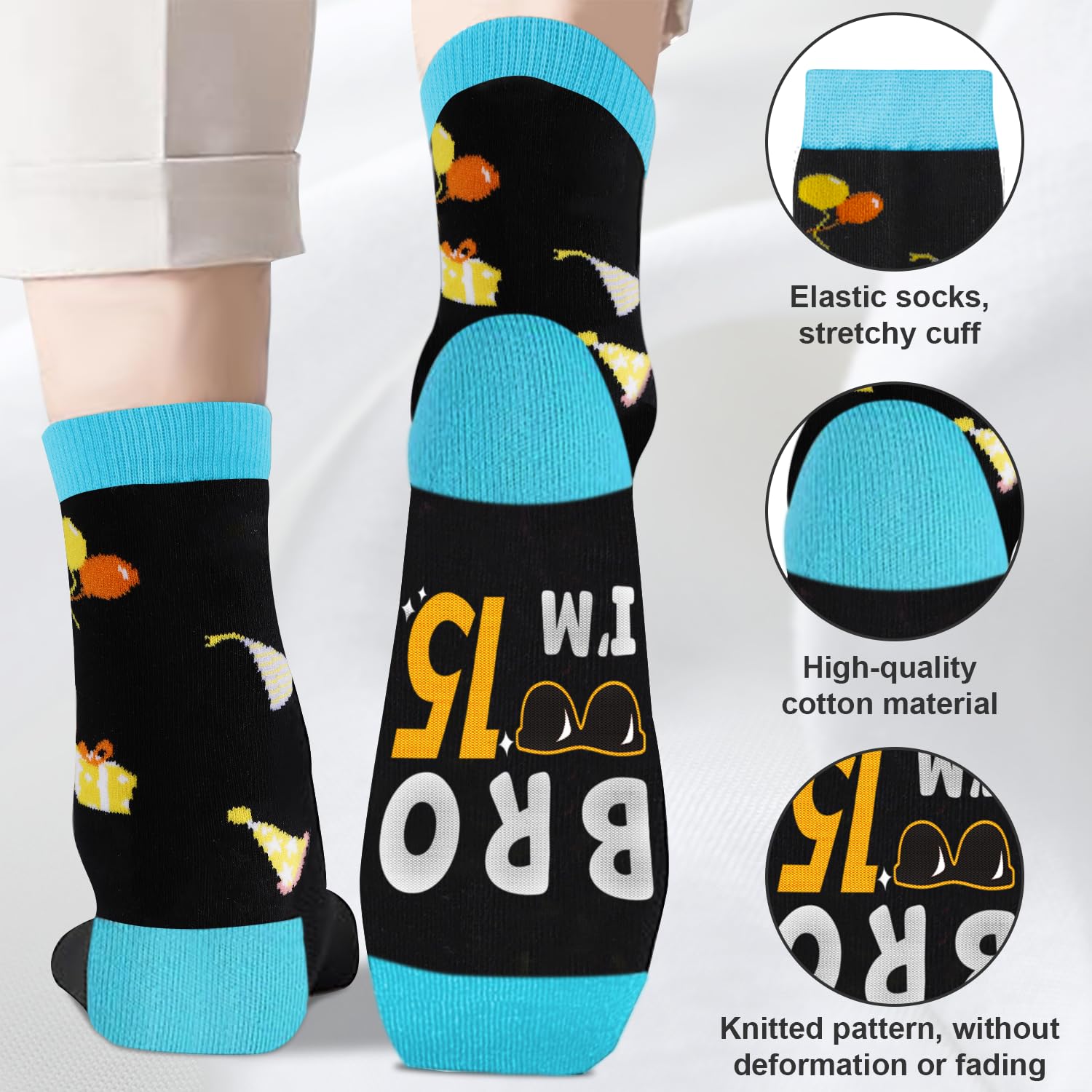 Socks for 15th Birthday Boys Design: Our socks are predominantly black, blue, orange and white, eature birthday gifts, balloons, cakes, and other birthday elements on the top, while the bottom is sewn with a hilarious hidden message: "BRO I'M 15." the young and energetic design, Suitable for 15th Birthday Gifts, Christmas Gifts, New Years Gifts or White Elephant Gifts