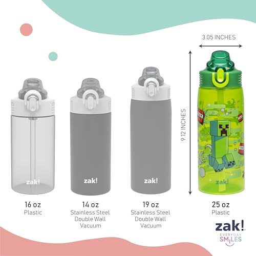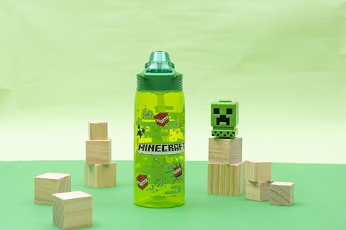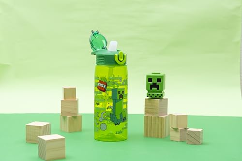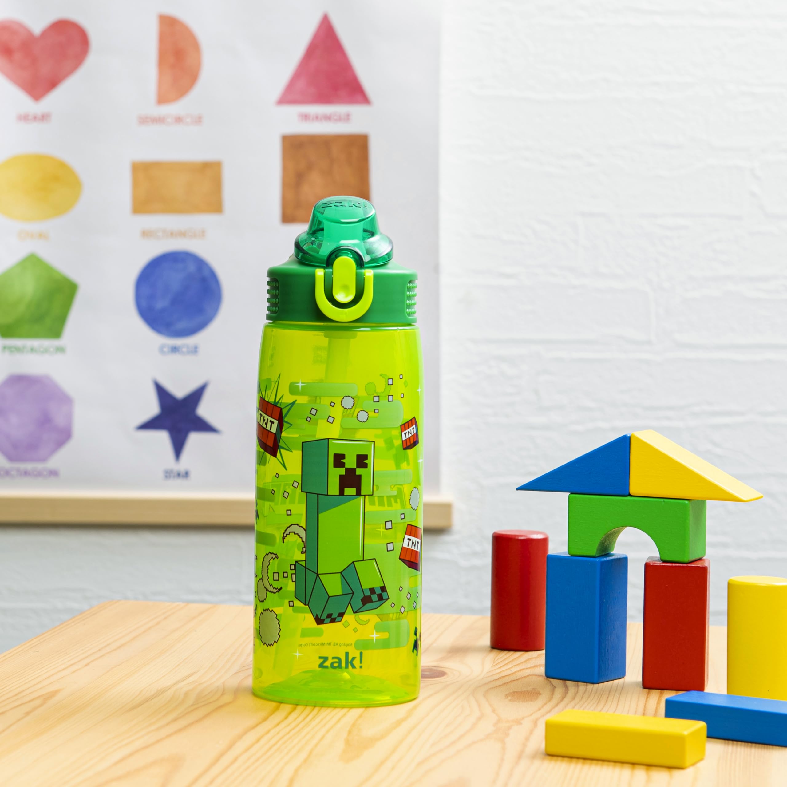 "Everyday hydration is simple and fun with this Minecraft water bottle from Zak Designs! Easy to Clean: The silicone spout and straw can be removed from the lid, and the pieces are dishwasher safe for simple cleanup at the end of the day. Reusable and Durable Material: Reusable water bottles will last wash after wash—good news for you and the environment! The 25 oz water bottle is made of PP plastic, durable enough to use every day and bring on any adventure. Leak-Proof Lid: The lid screws on securely and won't leak when the spout is closed, though water flows for easy drinking when the spout is open. The easy-open button has a flip-up lock to keep it from activating accidentally. On the Go: The water bottle has a built-in carrying loop on the lid for easy transportation, and with the spout cover to keep the spout clean and closed, it can be tossed into a bag for worry-free travel. Specifications: 25 oz capacity. Made of durable plastic. Dishwasher safe, do not microwave. Length: 4.23-inch, Width: 3.05-inch, Height: 9.12-inch. Character: Minecraft Creeper."
