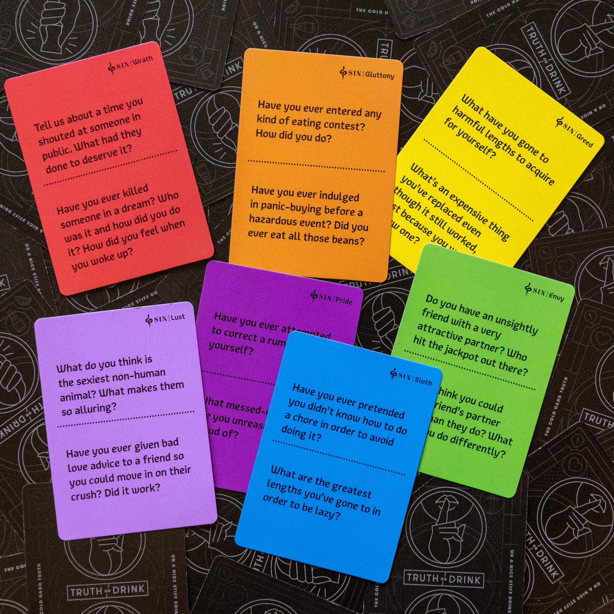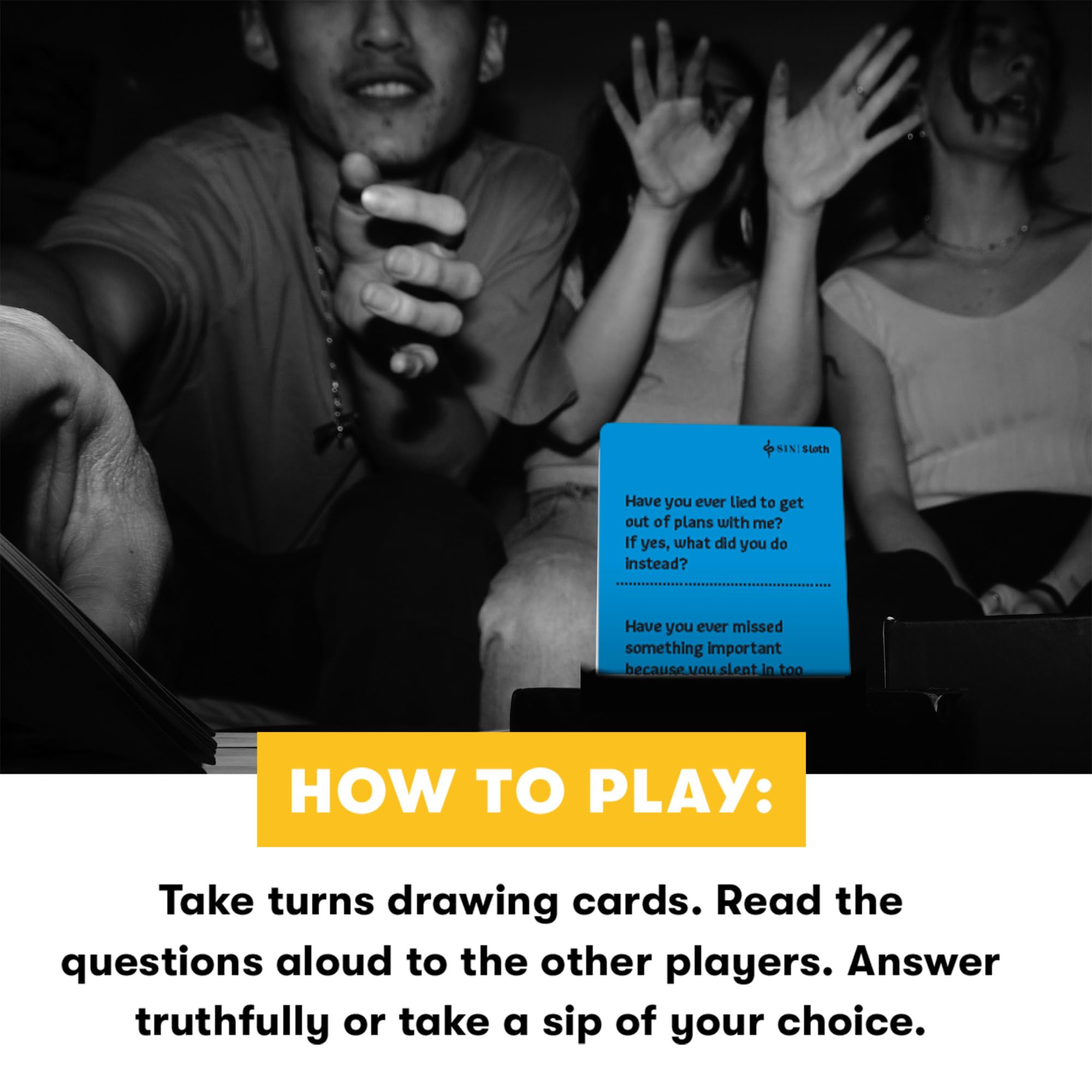 HOW TO PLAY: Draw a card and ask someone one of the questions. If you get a good answer, award the card as a point. But the other player has a choice: Answer the question or take a sip. After all, some sins should stay hidden