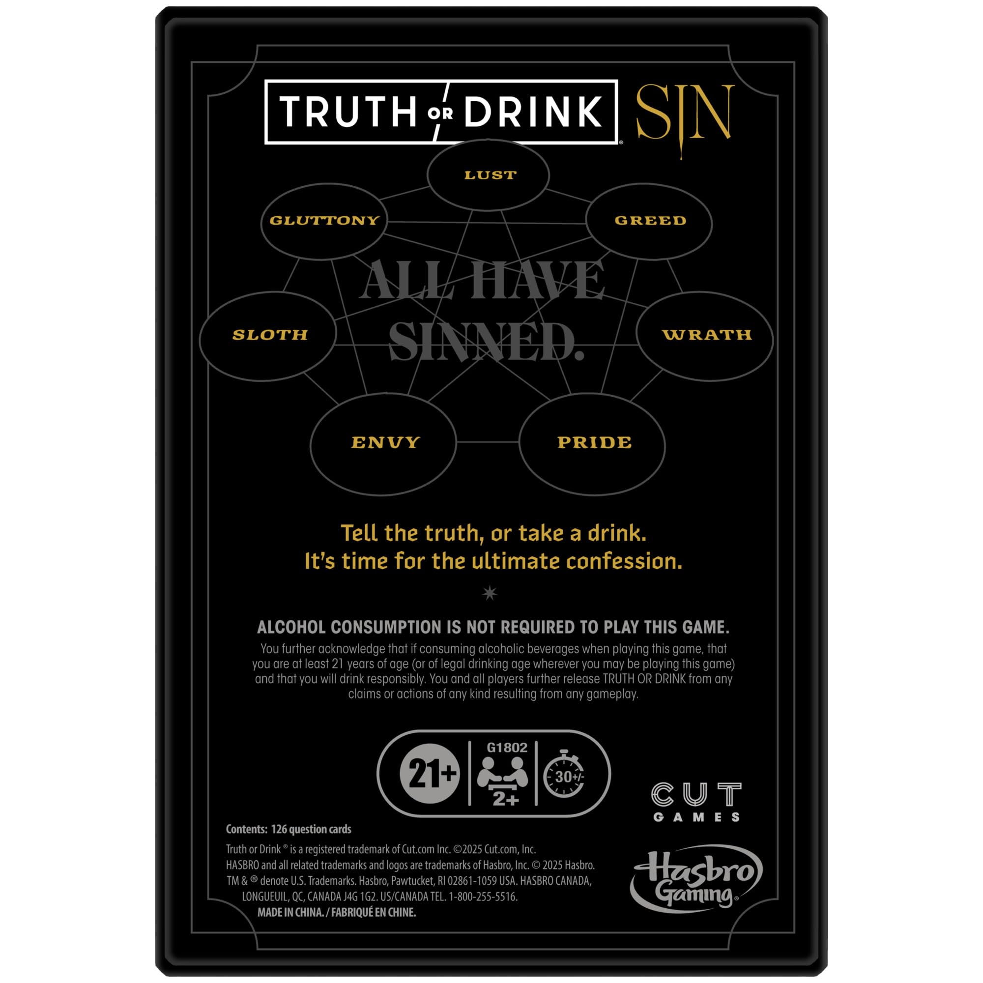 Tell the truth or take a drink. It’s time for the ultimate confession in the Truth or Drink: Sin Edition game! Based on the hit video series, the Truth or Drink games are the card games of honesty and hydration, and this edition offers a sinful spin. Get your friends and family to reveal their guilty pleasures with 250+ questions inspired by the classic Seven Deadly Sins. No topic is off-limits, and there’s nowhere to hide. Will you spill the truth or take a sip? The Truth or Drink: Sin Edition card game is sure to make some memorable stories at your next get-together. Play it as a stand-alone game or as an expansion to any other Truth or Drink game. Cut games are hysterical adult party games for game night, and NSFW games and travel games make cool gifts for adults ages 21+. (Alcohol consumption is not required to play this game.) Truth or Drink is a registered trademark of Cut.com, Inc. Hasbro and all related trademarks and logos are trademarks of Hasbro, Inc.