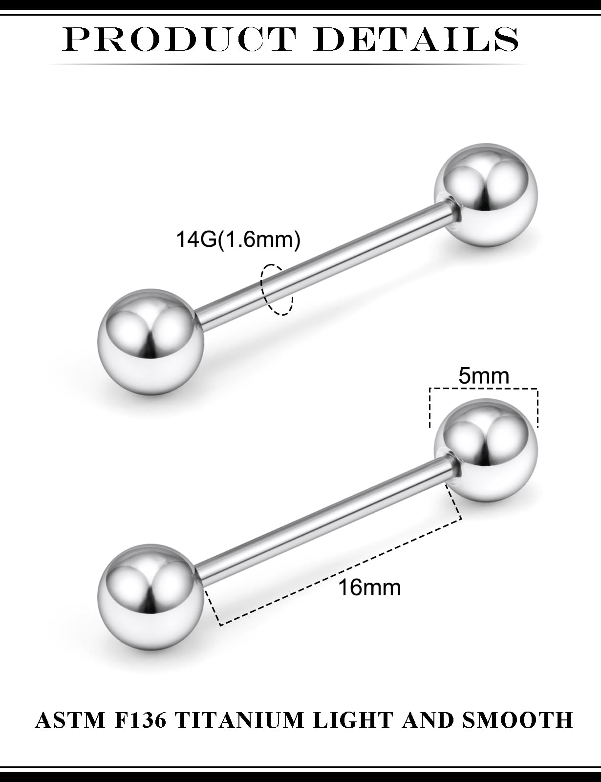 【Perfect size】: Straight barbell nipple tongue rings piercing jewelry gauge: 14G(1.6mm), bar length: 5/8 inch(16mm), top ball size: 5mm, color: silver