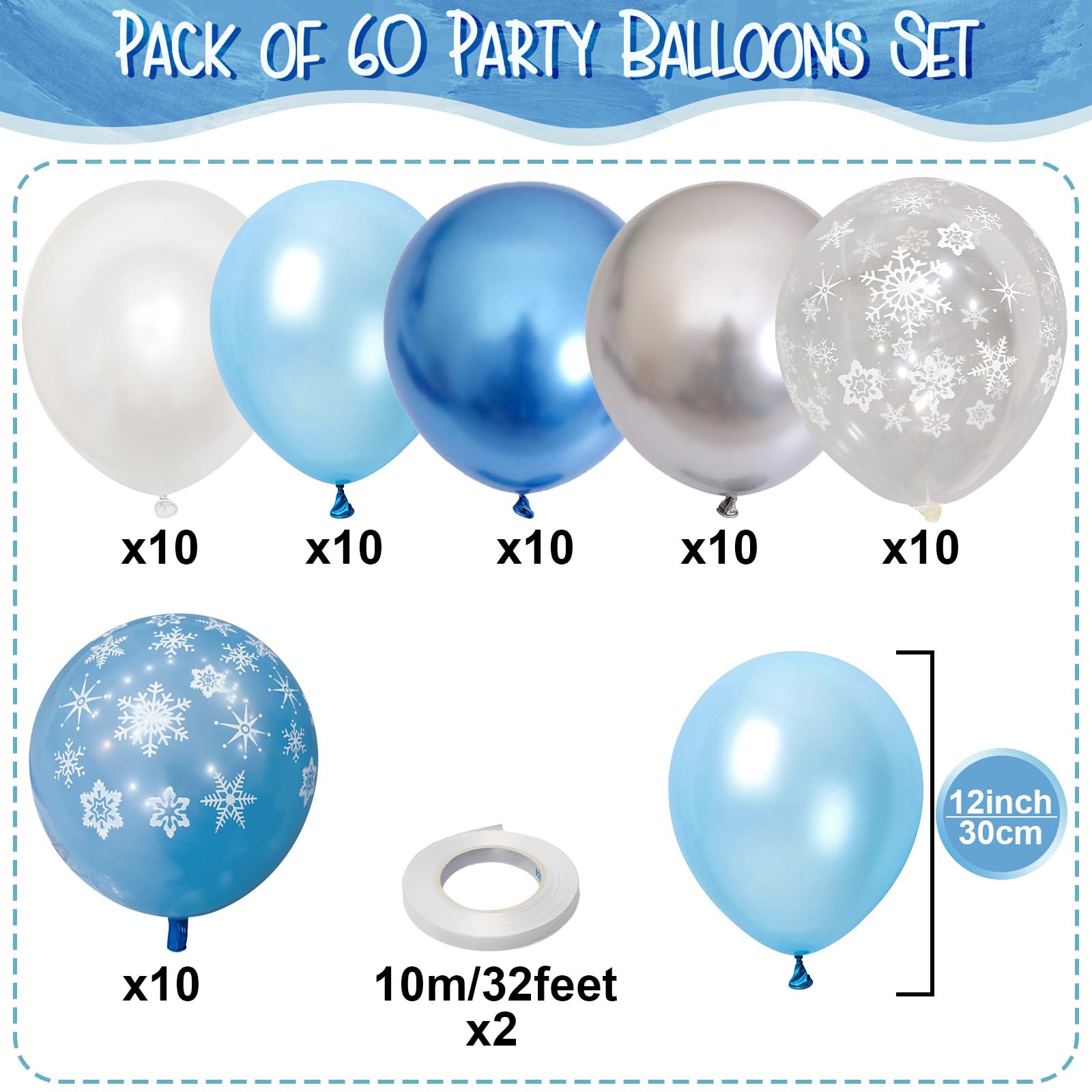 Package Includes – You will receive 60 pieces of 12-inch balloons in total: 10pcs pearl white, 10pcs pearl light blue, 10pcs metallic blue, 10pcs metallic silver, 10pcs clear snowflake print, and 10pcs blue snowflake print balloons. The kit also includes 2 rolls of 10-meter white ribbon, ensuring you have everything you need to decorate your event without buying extra supplies.