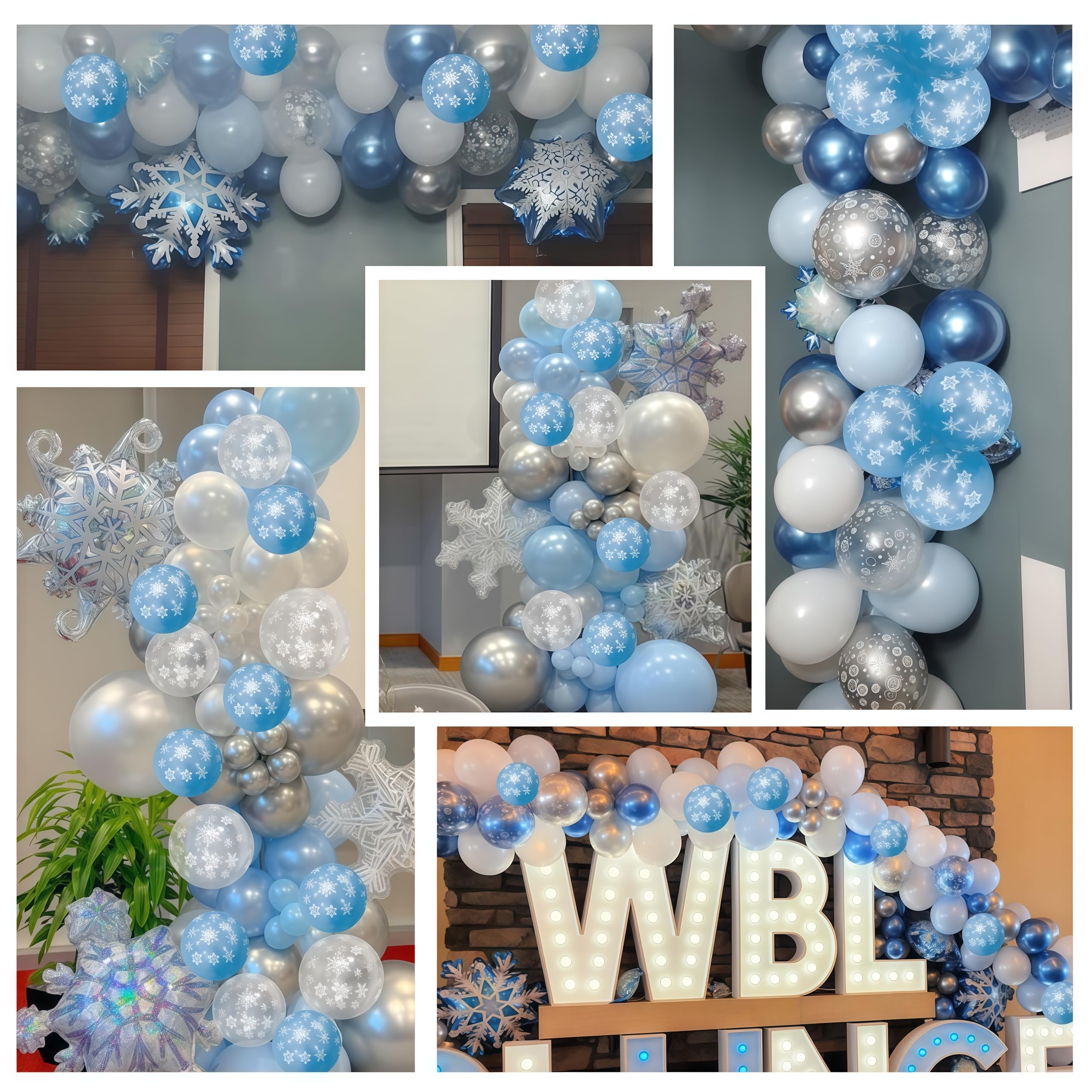 Winter Wonderland Theme – This balloon set features a stunning mix of pearl white, pearl light blue, metallic blue, metallic silver, clear snowflake printed, and blue snowflake printed balloons. The cool tones and festive snowflake designs create a magical winter wonderland look, making it ideal for Christmas parties, Frozen-inspired birthdays, New Year’s Eve, or elegant winter weddings.