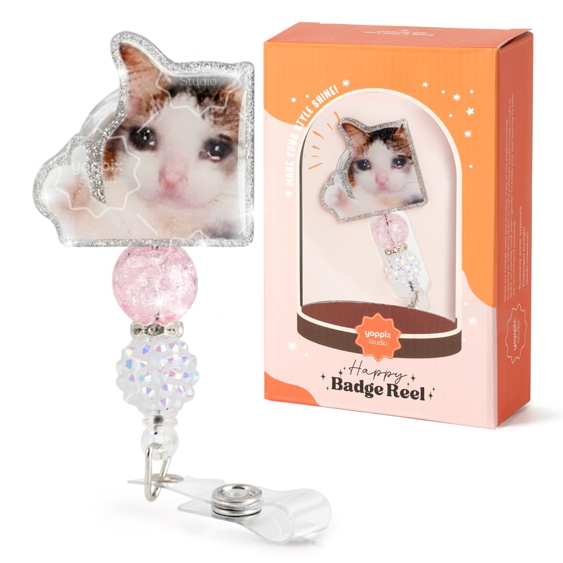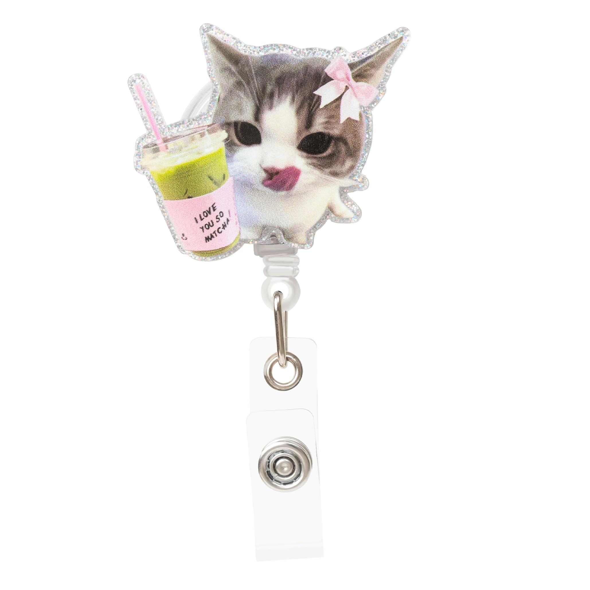 Retractable badge reel made of acrylic, resin, glitter and metal. Alligator clip with 360 degree rotation and extends up to 25 inches.