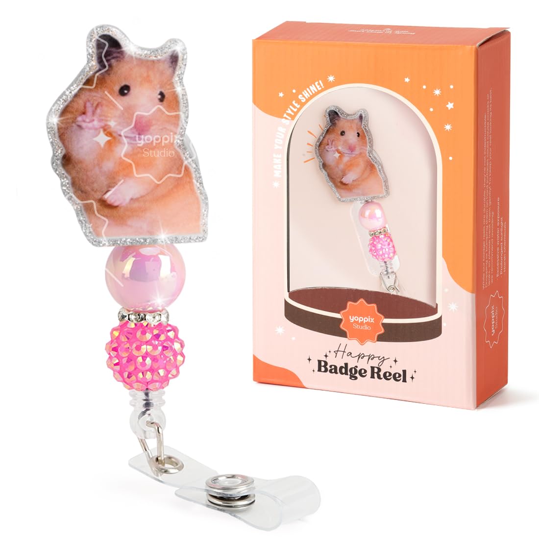 YOPPIX Funny Hamster Badge Reel, Cute Sparkly Glitter Retractable Badge Reel for Nurses RN EN Doctor Paramedic Teachers Medical Office Womens