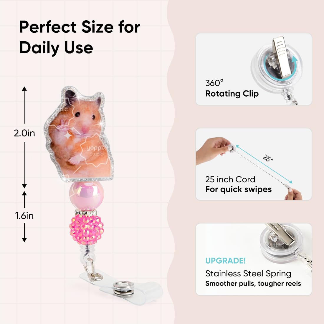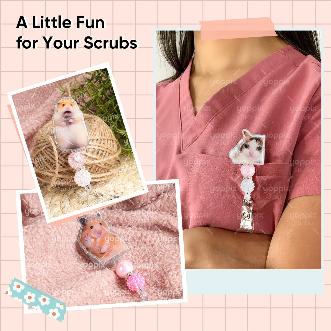 This funny hamster badge reels make an excellent gift or add personality of your own to your scrubs or uniform. They make super fun and useful gifts for any person in any profession. A great gift choice for nurses, teachers, students, medical staff, office staff, and anyone who is required to wear an identification badge.