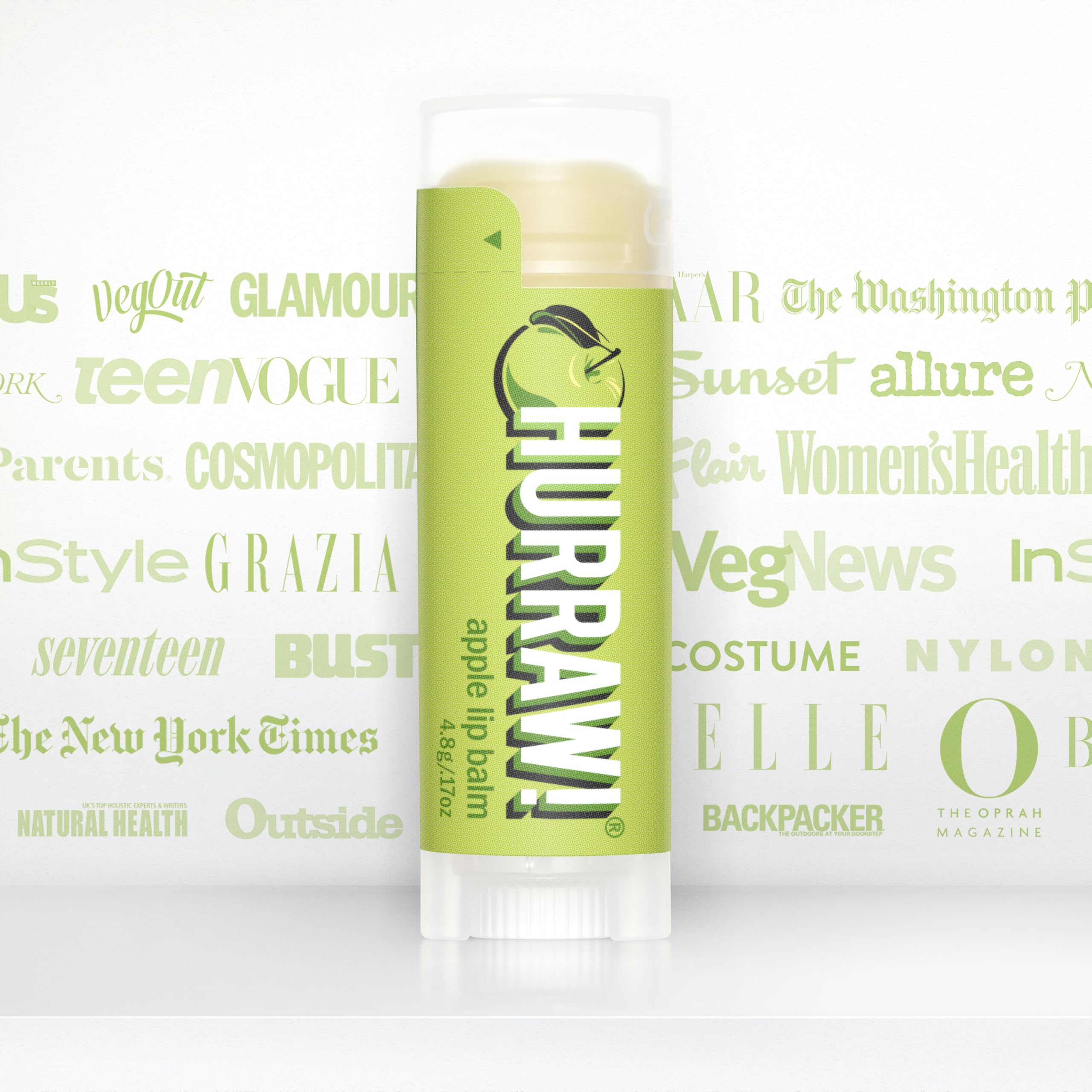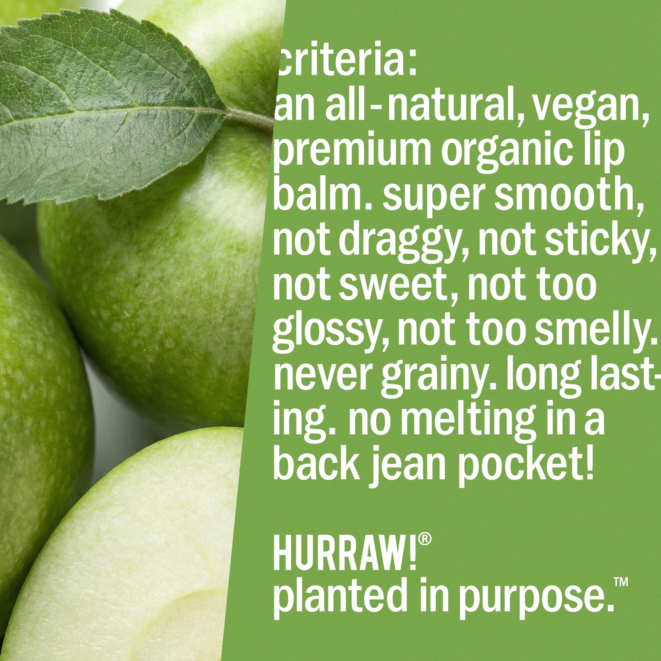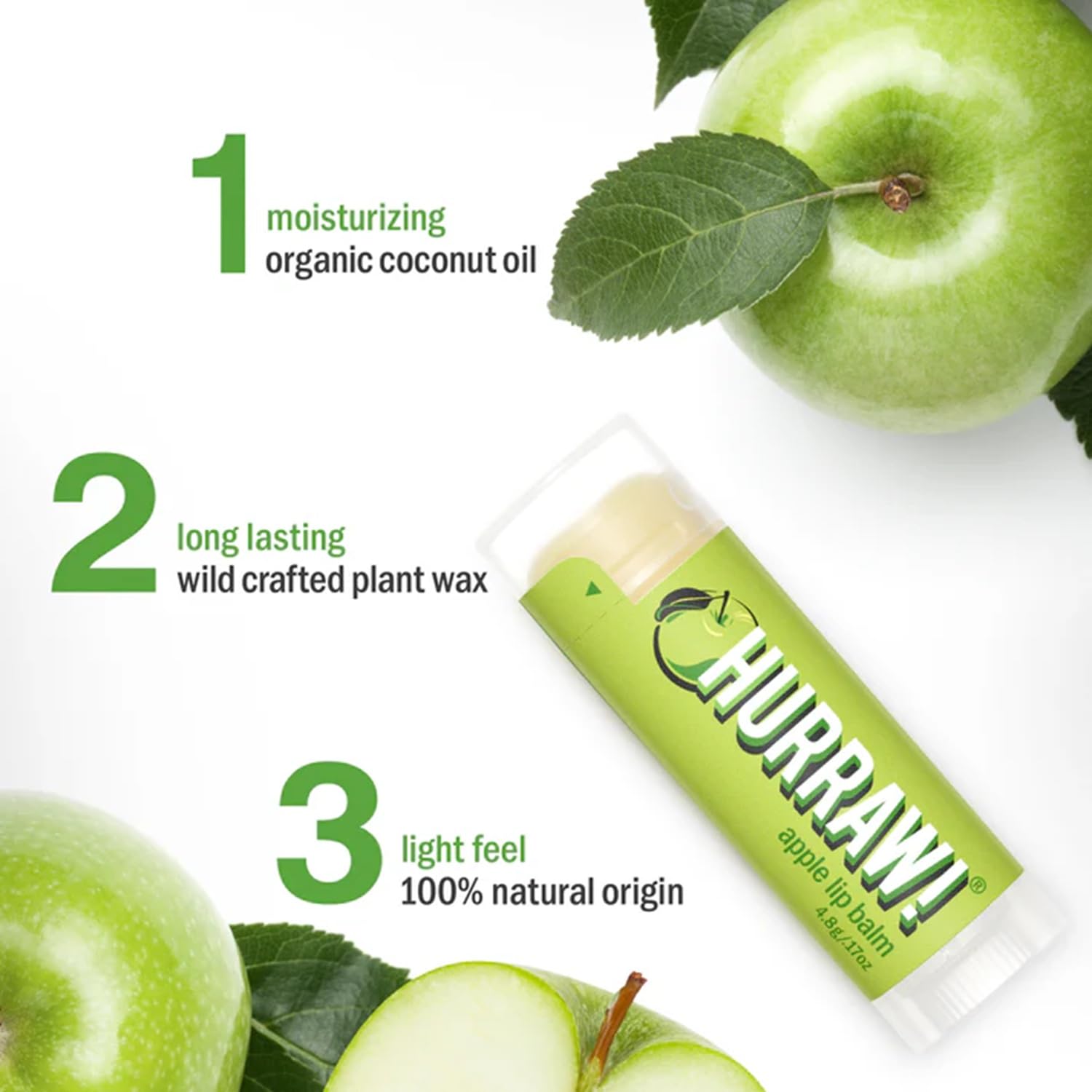 ONE 4.8g/.17oz Oval Tube of HURRAW! Apple Lip Balm packaged in a white HURRAW! branded pillow box. Ahiflower oil shines in this omega loaded balm! Golden apple flavor with a hint of tartness; your new fresh pick! Made with certified organic, vegan, and raw ingredients. Hurraw! Lip Balms are certified 100% all natural origin, cruelty and gluten free. Non-GMO. Bee, Shea, Soy and Palm Free.