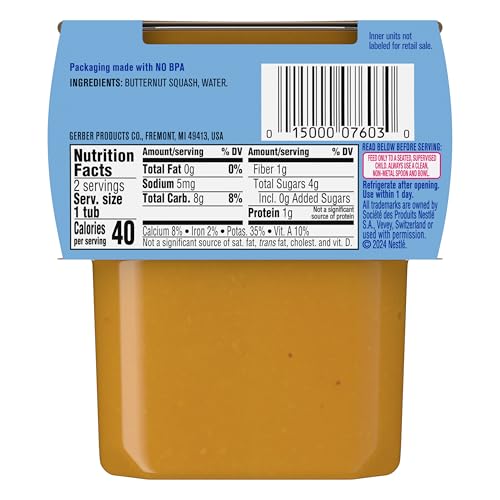 Gerber Stage 2 Baby Food, Butternut Squash Puree Tubs are a premium choice for your child’s early stages. Crafted to help support their nutritional needs, along with meeting the busy lifestyle needs of caretakers and parents. Each baby puree tub contains 1/3 cup of squash and comes in a portable, easy-to-store format – making it perfect for life’s busy moments. This stage 2 baby food puree is designed for babies who are 6 months + and are ready to explore new textures and flavors. The butternut squash is finely pureed to ensure a smooth and enjoyable eating experience for your little one. Gerber understands the importance of providing wholesome ingredients during the crucial developmental stages of your child's life -- that’s why our butternut squash baby food is Non-GMO Project Verified. These tubs have no added salt and have no artificial flavors or colors. They need to be refrigerated after opening and must be used after 1 day. Gerber baby puree is ideal for parents who seek a convenient and high-quality option in their baby's diet.
