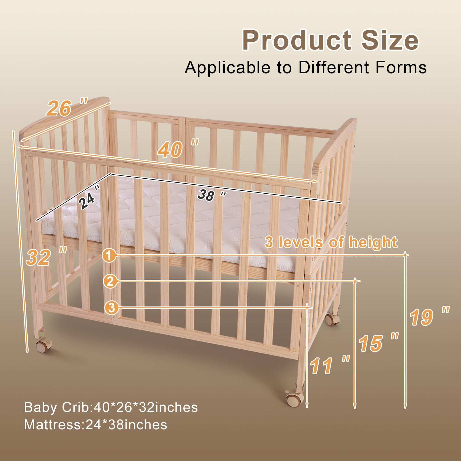Size:Bedside crib:40*26*32",including mattress:38*24,pefect size for bedrooms without taking up more space,and the mini crib is equipped with four universal wheels,very easy to move;