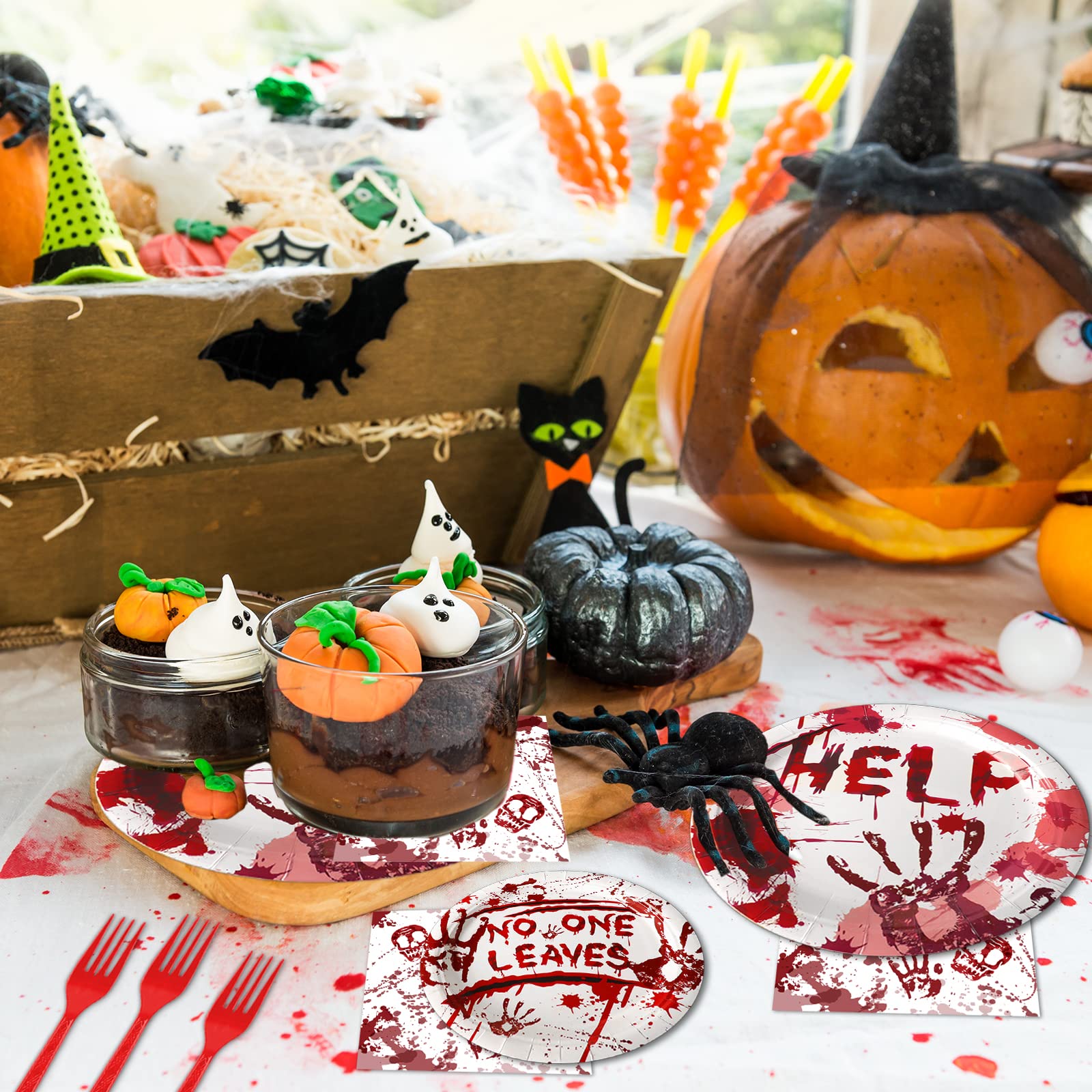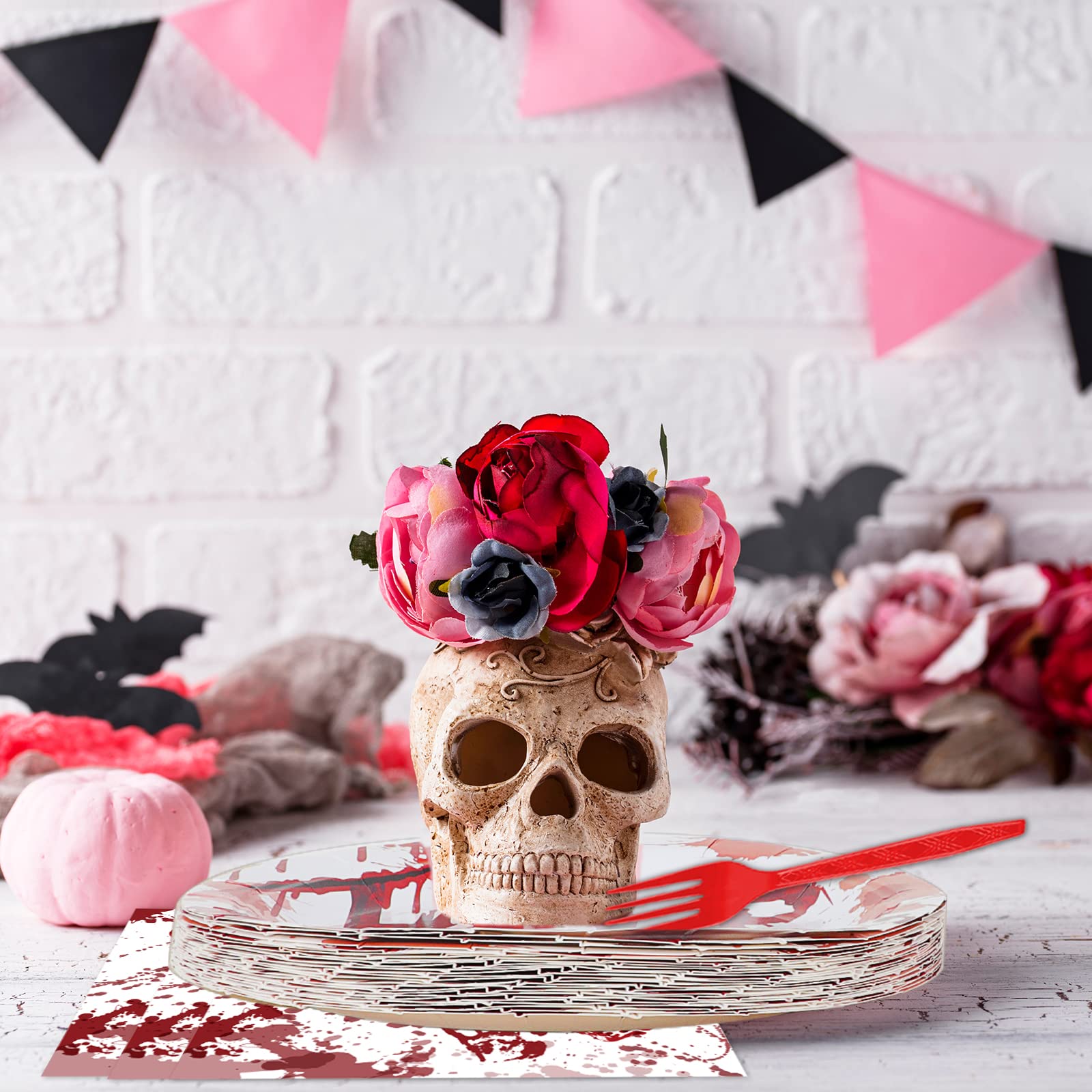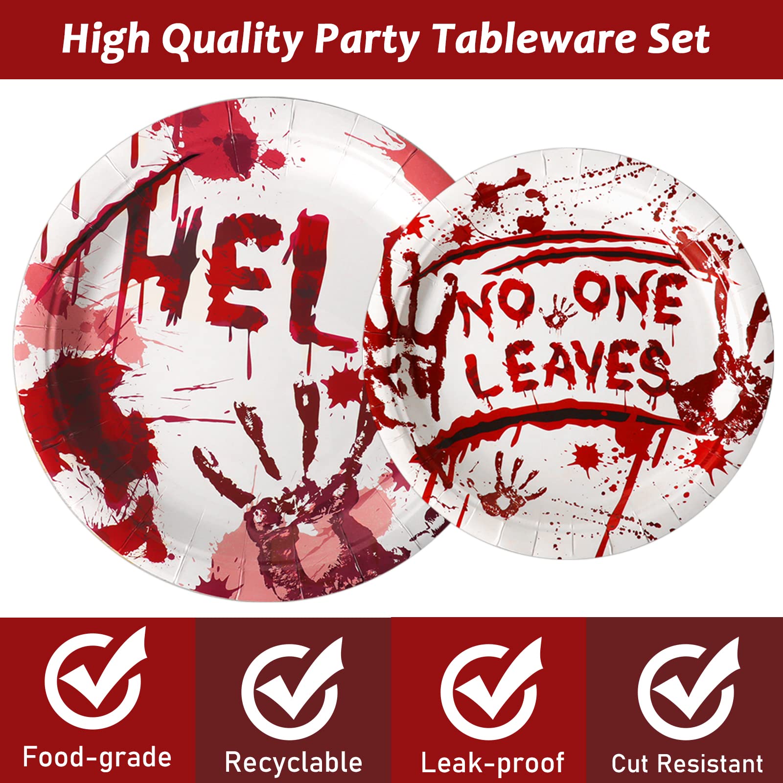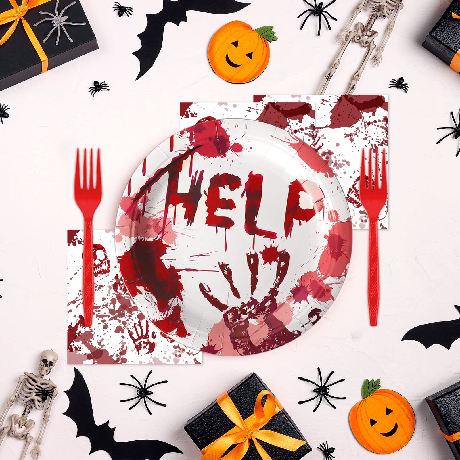 【Bloody Good Time Party Supplies】You will receive 24 pieces bloody good time party paper dinner plates of 9’’, 24 pieces plates of 7’’, 24 pieces bloody good time napkins of 6.5’’ and 24 plastic red forks for each set that can serve 24 guests.