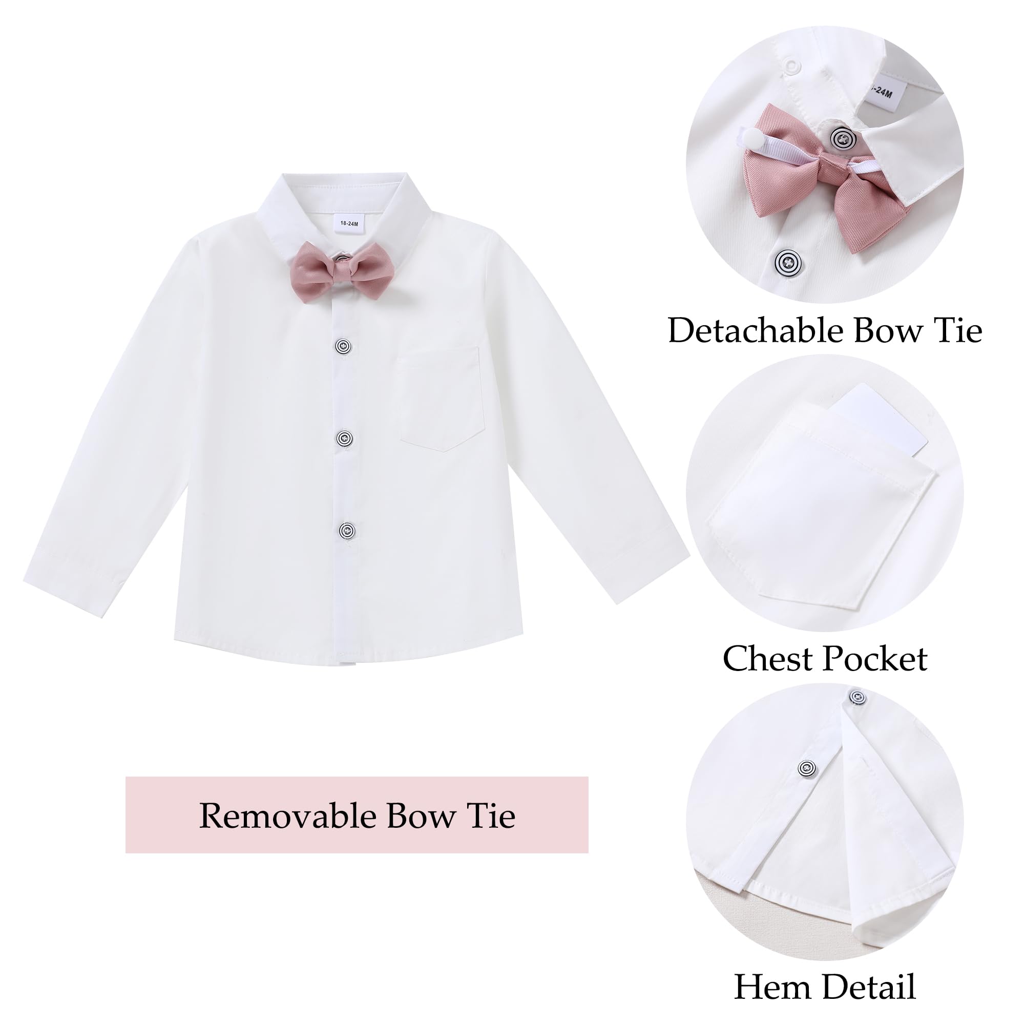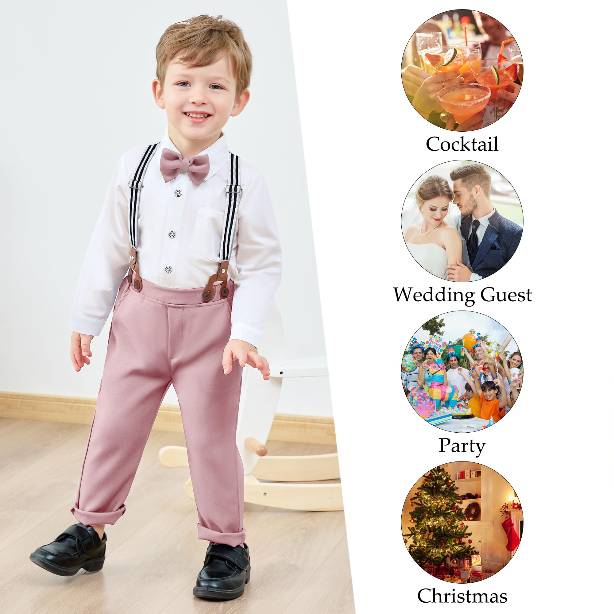 Design: Toddler boy dress clothes, classic color matching detachable bowtie and suspender pants. You'll never worry about how to match your cute boy!