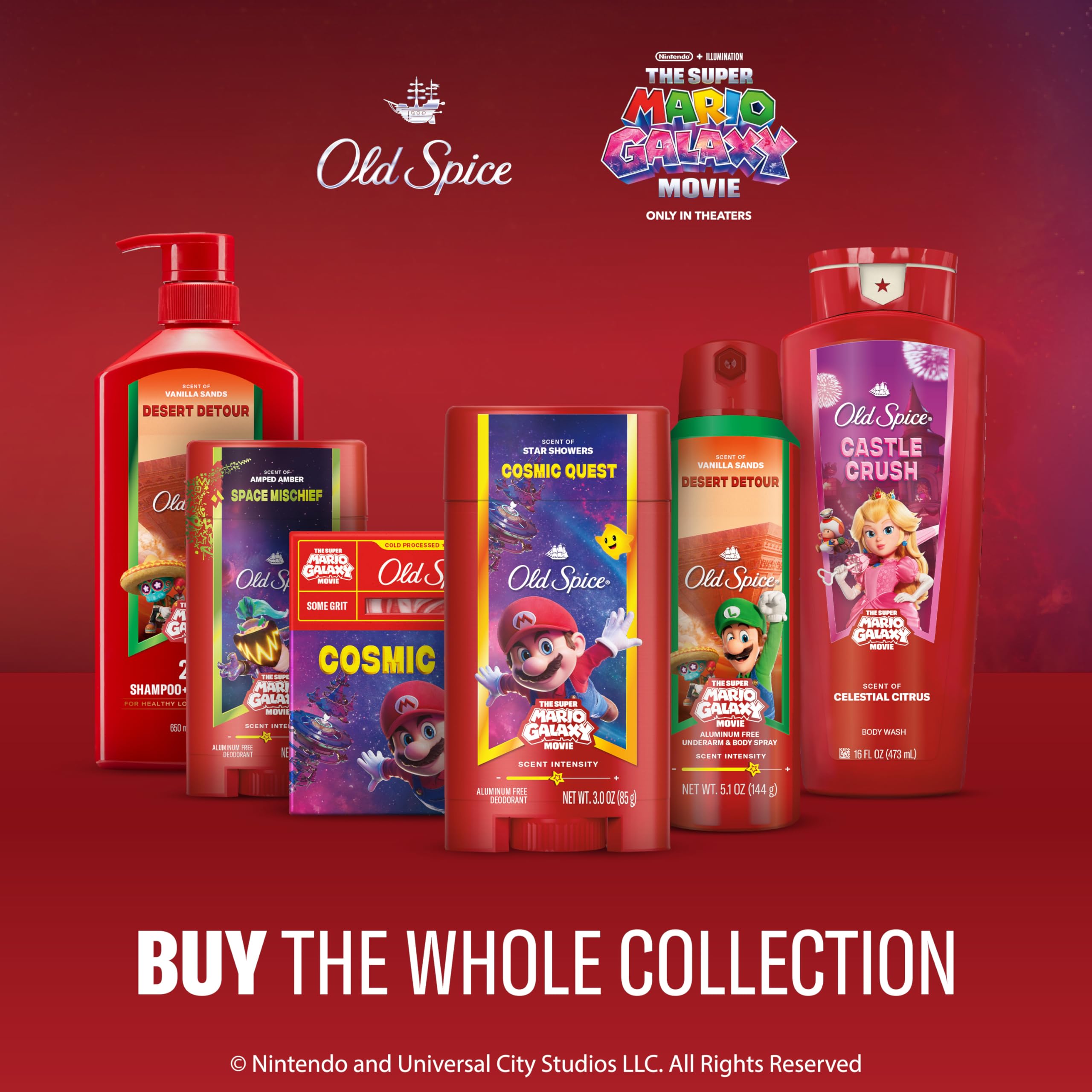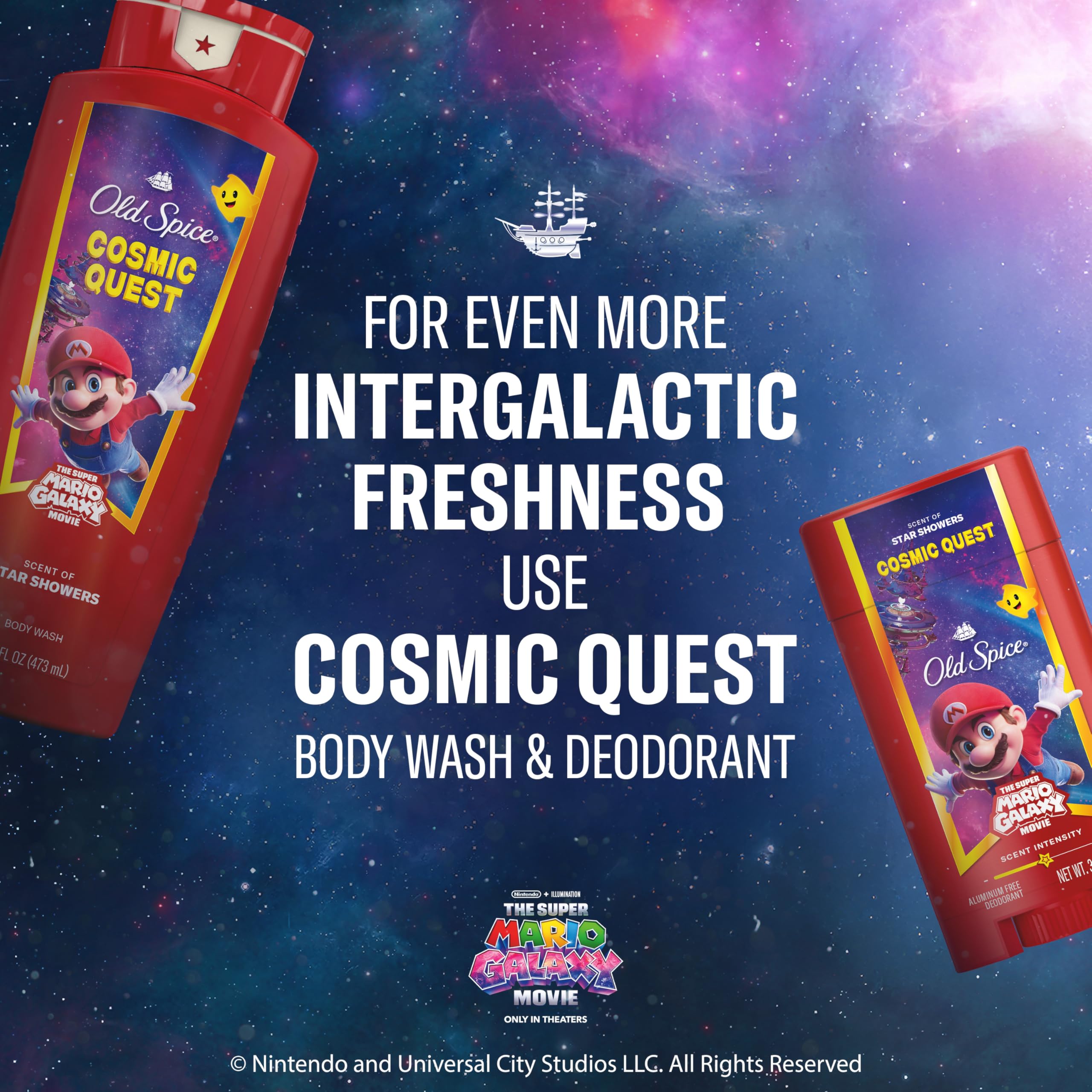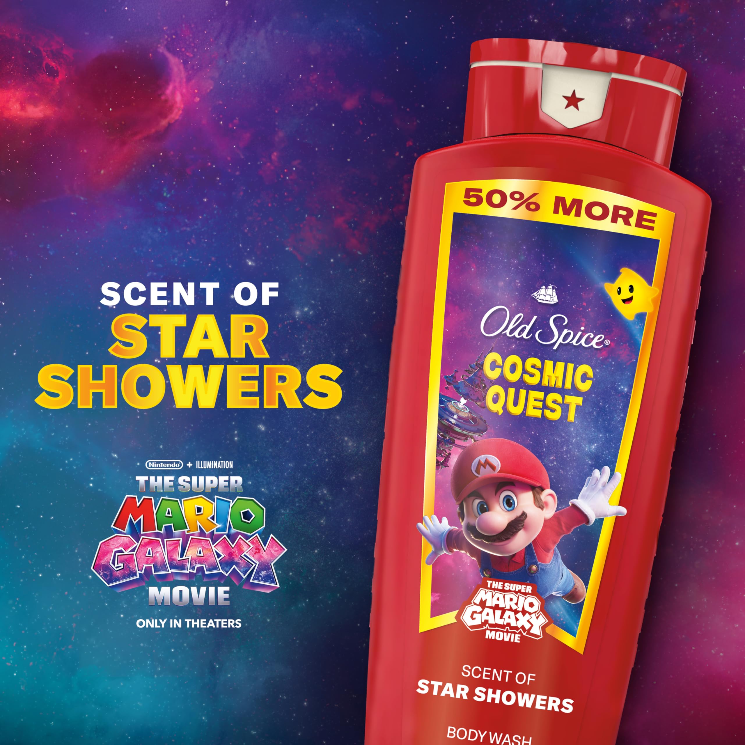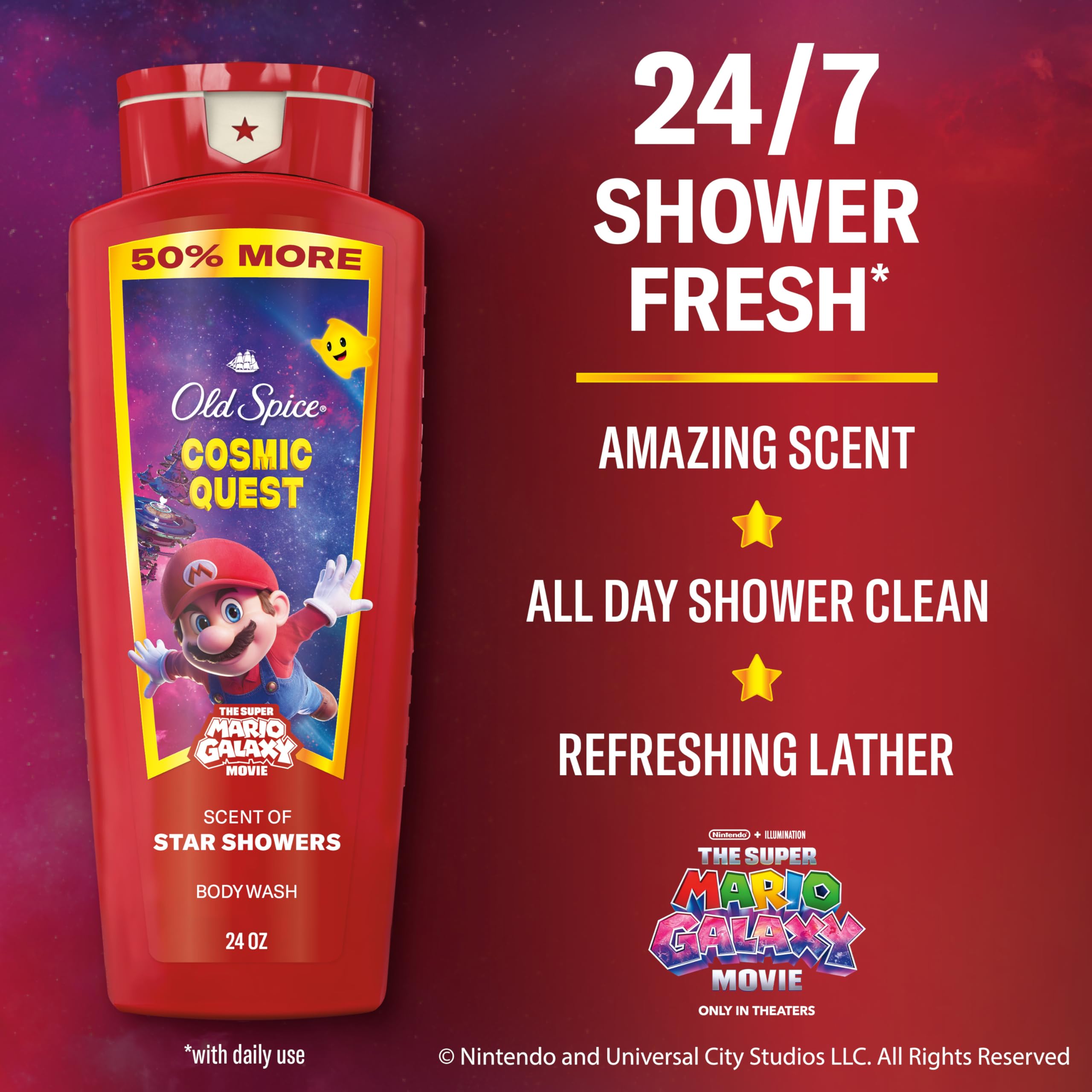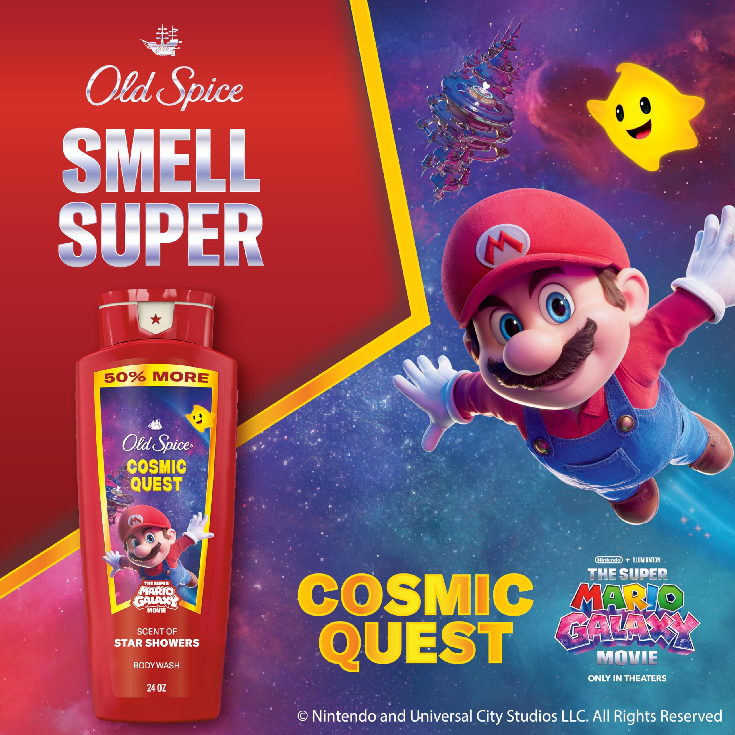 Trade in your normal routine and power-up your shower with Old Spice Cosmic Quest. Old Spice x The Super Mario Galaxy Movie Body and Face Wash for men is a cleansing body wash with a rich lather that washes away dirt and odor with out-of-this-world scent. This Special Edition body wash is specifically formulated as a 2n1 for your body and face to stay 24/7 Shower Fresh with daily use. Smell Super with Cosmic Quest and the Scent of Star Showers.