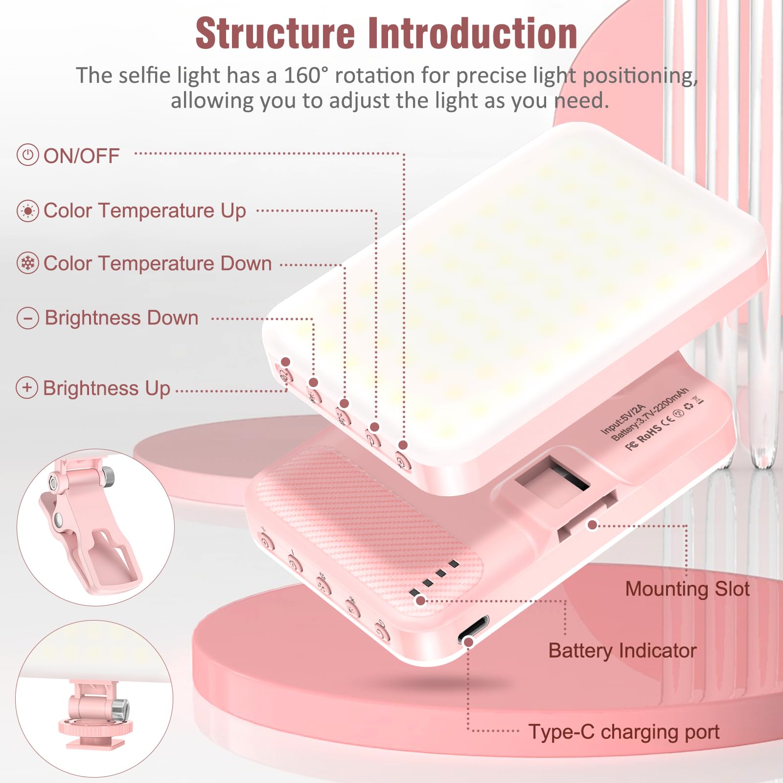 【Compact Pocket Size】Portable phone light clip only weighs 95g, perfectly fits in your pocket or pouch (Dimension: 3.9*2.8*0.78in). This mobile phone fill light can be a perfect gift for friends, family, colleagues, lovers who like to take selfies or post a lot of videos, I believe they will like it very much. Package Contents: 1* LED Video Light, 1* Clip, 1* USB-C Cable, 1* 1/4’’ Nut Adapter, 1* 1/4’’ Hot Shoe Mount, 1* Storage Pouch, 1* User Manual.