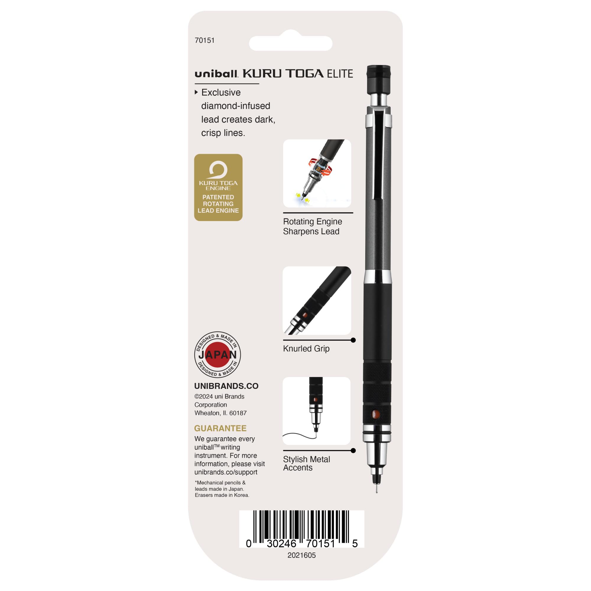 Upgrade your writing style and precision with the Kuru Toga Elite Mechanical Pencil featuring an intricate 0.5mm tip. The sleek metallic body with metal accents and knurled grip paired with advanced engineering gives this mechanical pencil the ability to work with your most important projects. Kuru Toga Elite’s self-sharpening lead engine ensures lead is always sharp and precise. Extra-durable nano diamond lead contains tiny diamond particles for strength, giving you smoother writing with darker lines. This refillable mechanical pencil also includes a replaceable eraser for easy revisions. With its high-end style and performance, Kuru Toga Elite needs to be shown off.