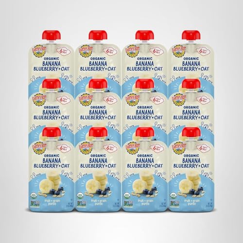 ORGANIC BANANA, BLUEBERRY, AND OAT PUREE: Includes twelve 3.5 oz pouches of Earth's Best Organic Wholesome Breakfast Puree