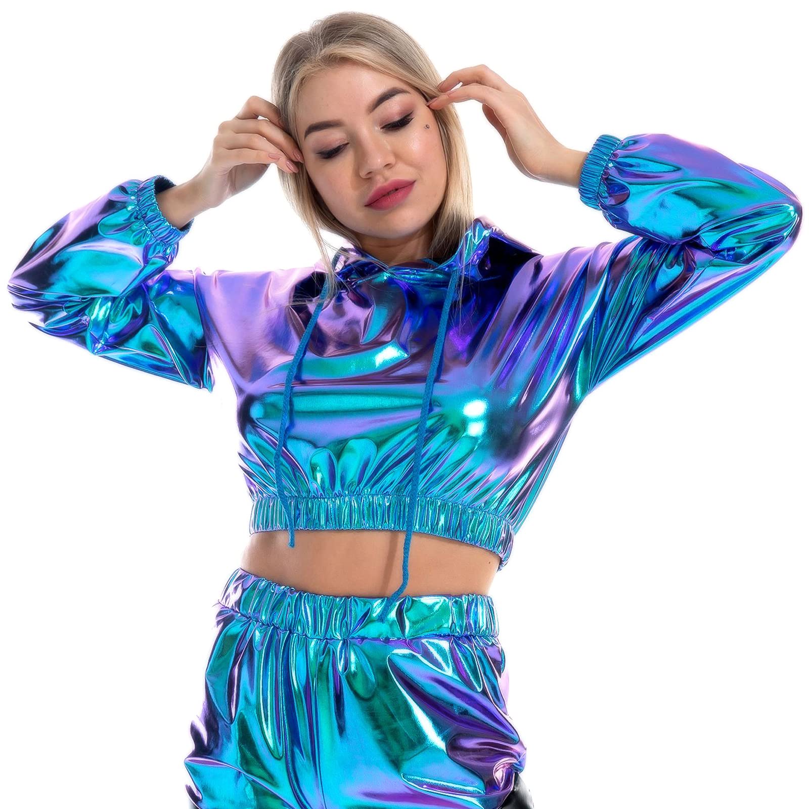 Shiny Crop Top: Shiny metallic long sleeve crop top for women, casual long sleeve sweatshirt hoodie drawstring loose pullover holographic hip hop crop top street club wear.