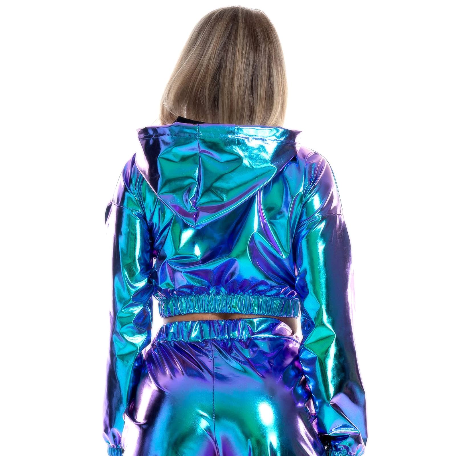 Novelty Design: The crop sweatshirts for women is designed with a shinning patent leather look, holographic color, looks very shiny and glossy, fulls of personality. Cute hoodie with adjustable drawstring design can adjustable the hat size to suit for yourself. The wet look crop top will show your sexy curve, make a eye-catching look in crowd.