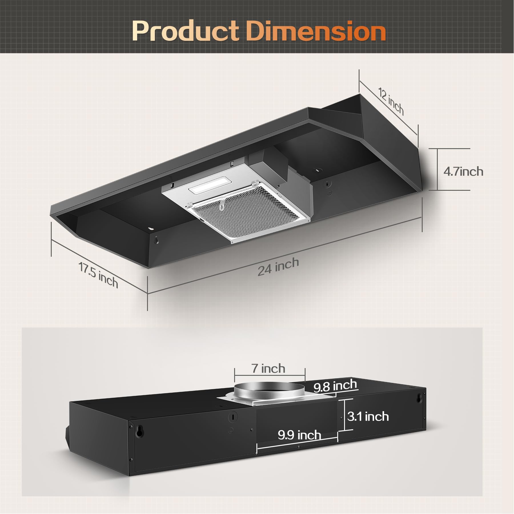 24 inch Range Hood with Slim Design: With the slim and stainless steel body, this under cabinet range hood is space-saving and easy to install. The rocker button can control 2-speed wind speed and LED lighting, which is easy to operate. Product Size: 24 inch x 17.5 inch x 4.7 inch( L x W x H). (Hardwire installation, plug sold seperately Part#ZMS-3976-PC)
