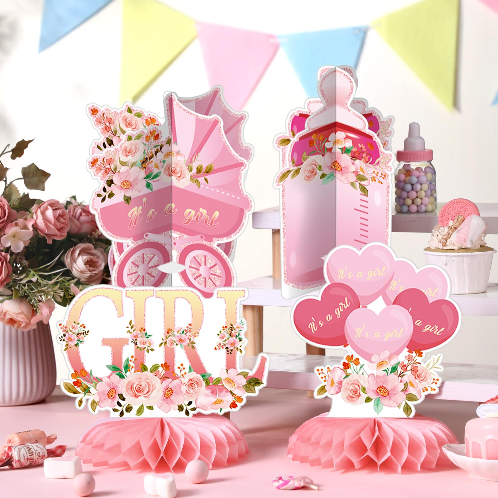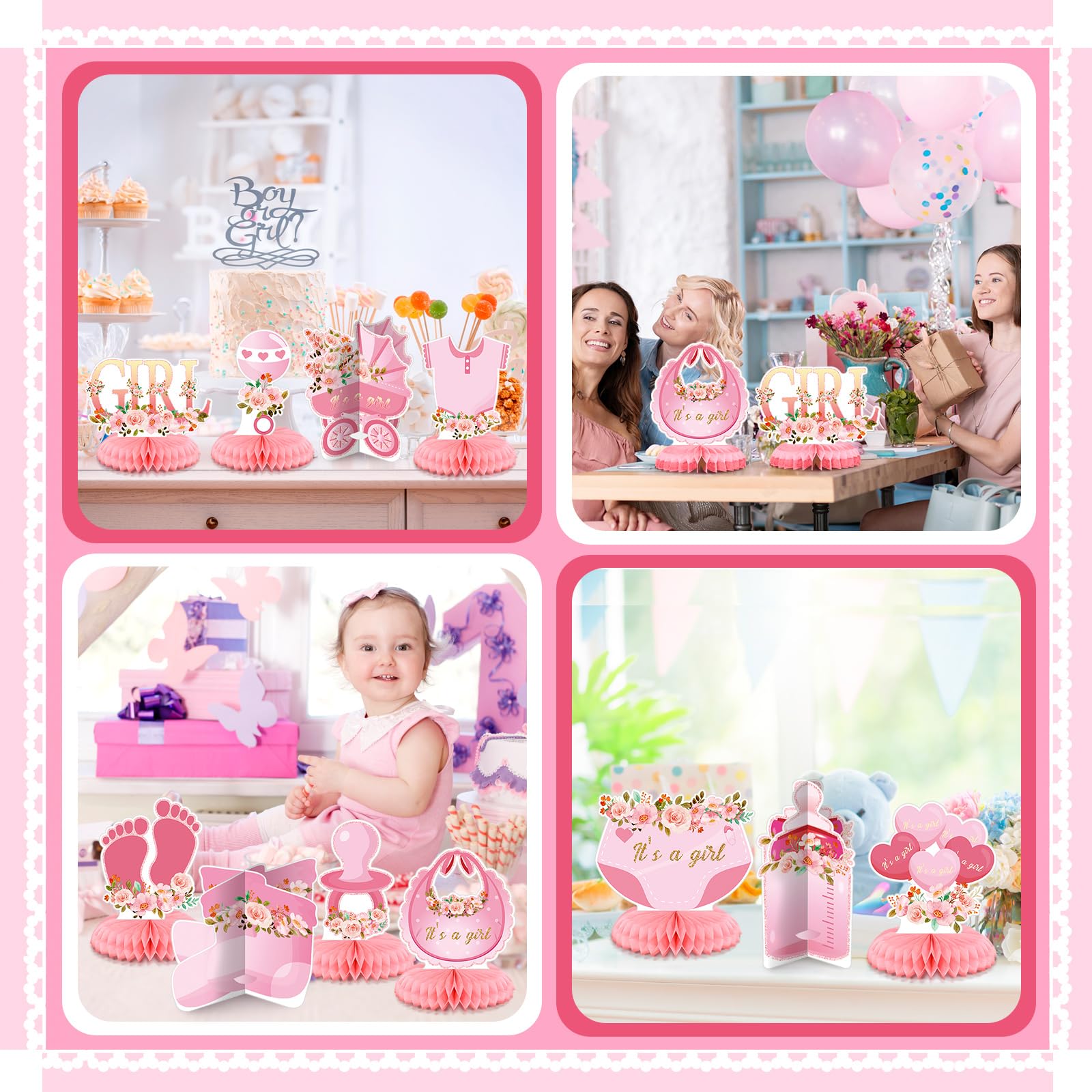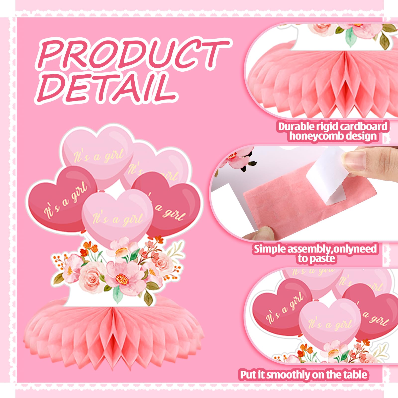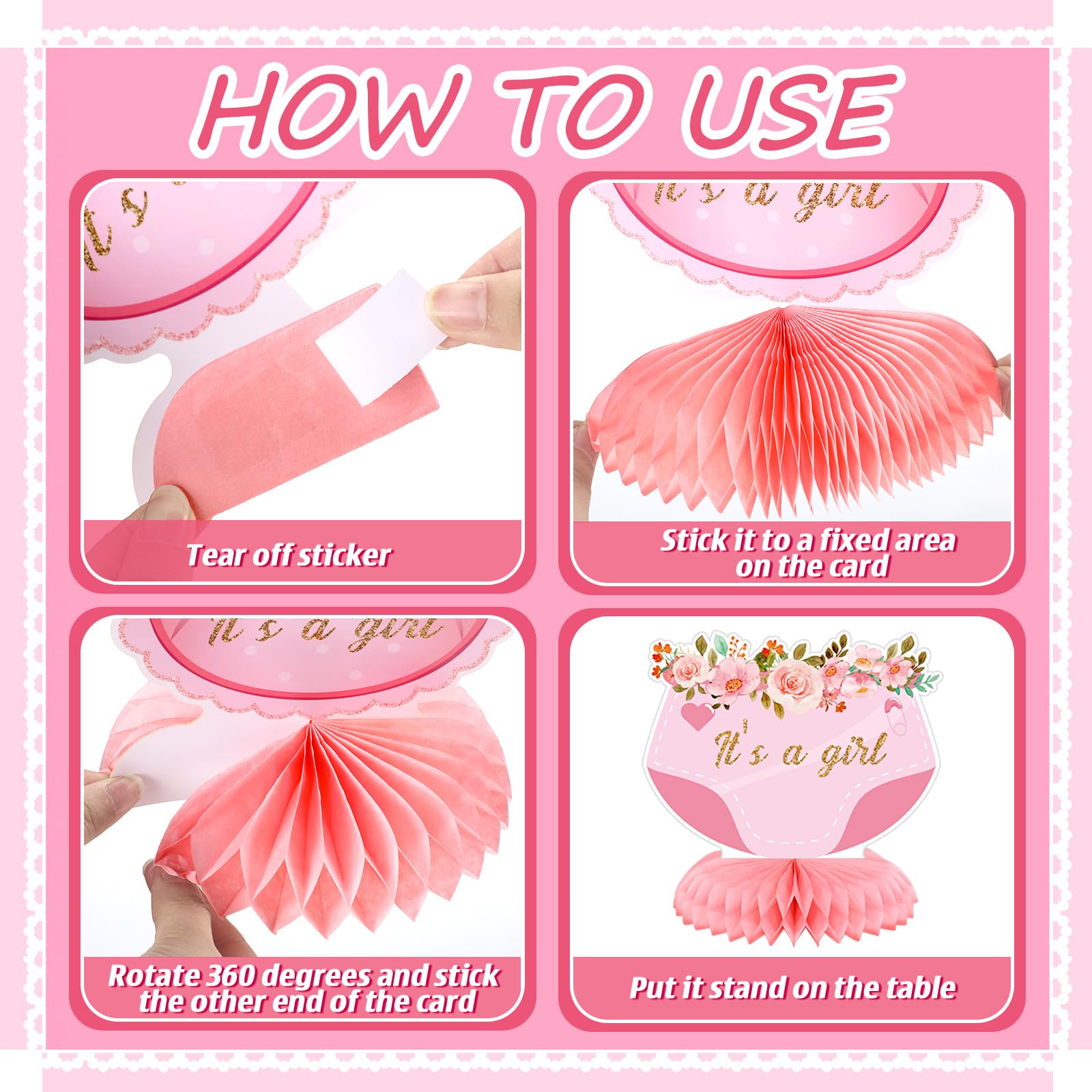 Easy to Assembly: first, you need to tear the sticker down the pink baby shower table decoration, then put it on the fixed area of the card, put a honeycomb ball on the other side of the card, and finally assemble a honeycomb ornament