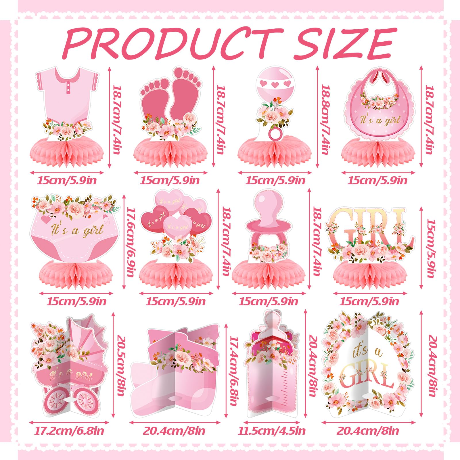 Packaging Information: there are 12 pieces pink baby shower honeycomb centerpiece, including pacifier, shirt, balloon, bottle, etc. Whether you are holding a small party or a large party, our packaging can ensure that the corner of your activity place is covered to enhance the atmosphere