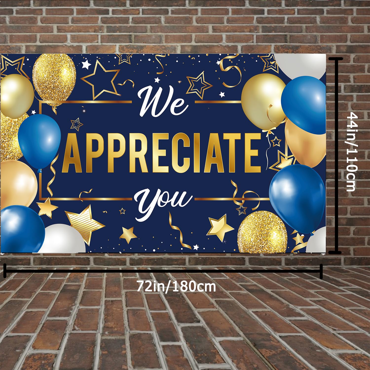 Material: Cloth fabric, which is easy-carrying, light weight, collapsible, washable and tear-resistant Package: 1 pack blue & gold "We Appreciate You" backdrop and 1 rope to help hang.What's more, the creases by can be decreased by ironing, steaming, and or wrapping around a cylinder before party Size: 72 x 44 inches, It's big enough and suitable for appreciation party backdrop decorations and photography Original Design: unique design, designed by professional designer independently. High quality resolution digital print with eye-catching details and life like colors Appreciation backdrop: perfect for appreciation party, indoor, outdoor thanks theme party decorations, home party, office party, Employee Veterans Teacher Doctor Nurse Staff appreciation partydecoration,Thanksgiving decorations,etc. It's also an ideal gift for home or friends