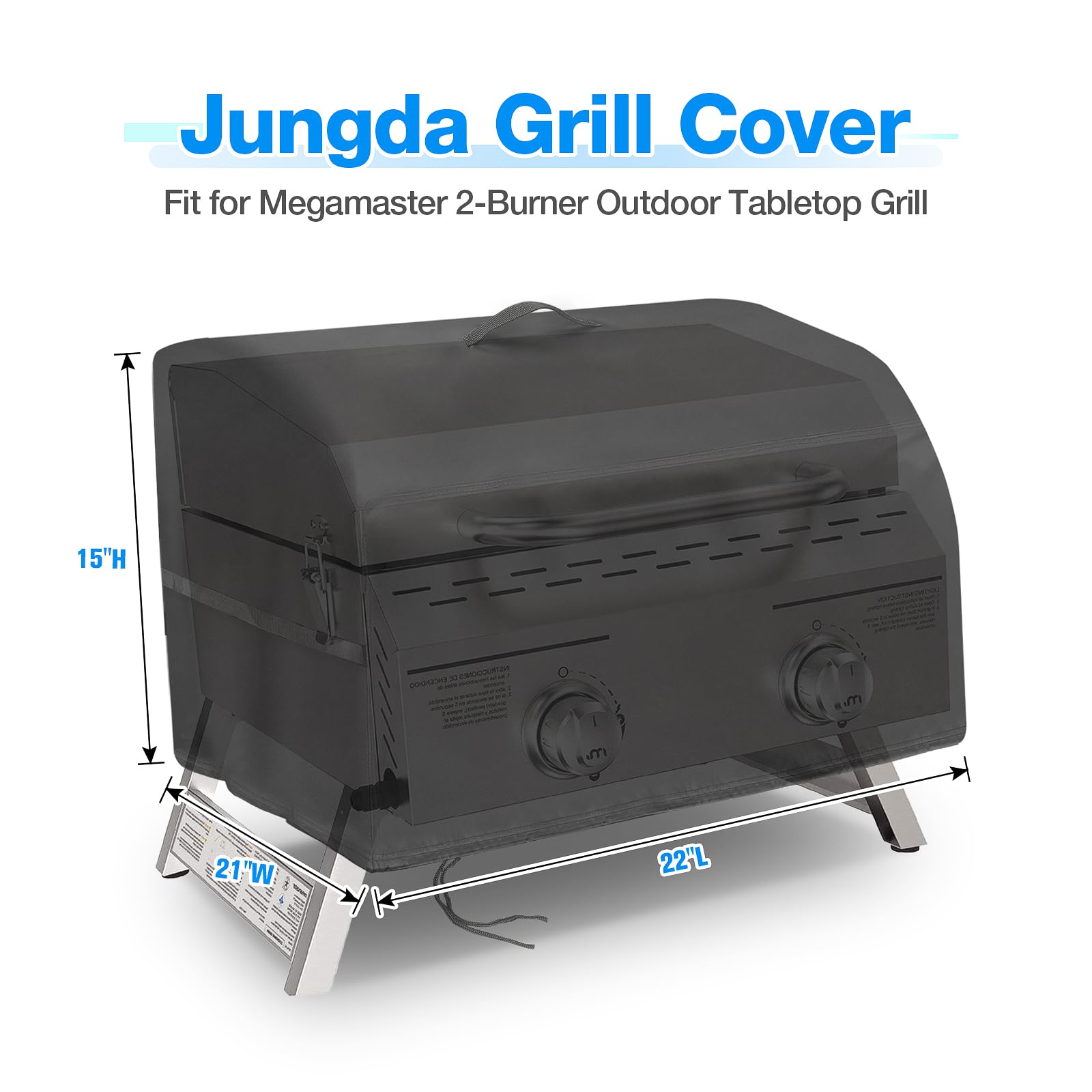 Size: 22"L x 21"W x 15"H; The outdoor tabletop grill cover is compatible with megamaster 2 burner tabletop grill,Can also be used for similar sized table top bbq grill, fits like a glove