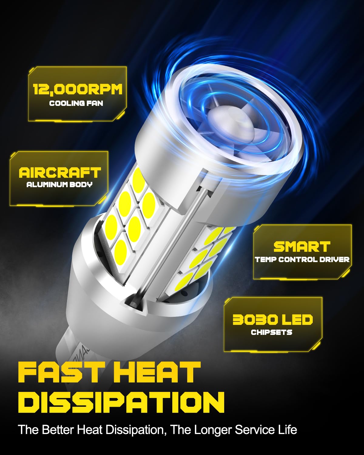 50,000 Hours Lifespan: Whole aviation aluminum body and 12,000RPM turbo cool fan that diverts heat away from the light's critical components, AUXITO 912 LED backup light bulbs offer 50000hr lifetime, reducing the need for frequent replacements.