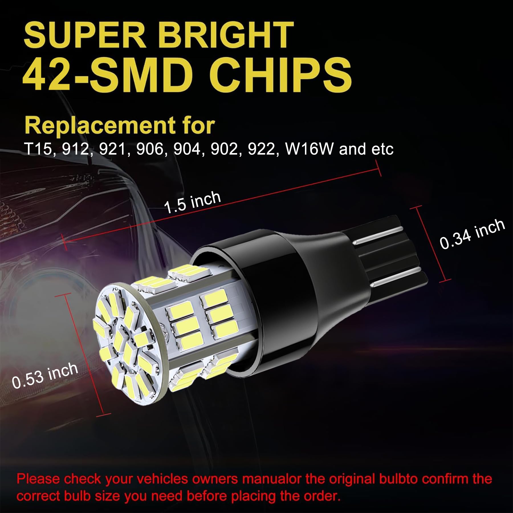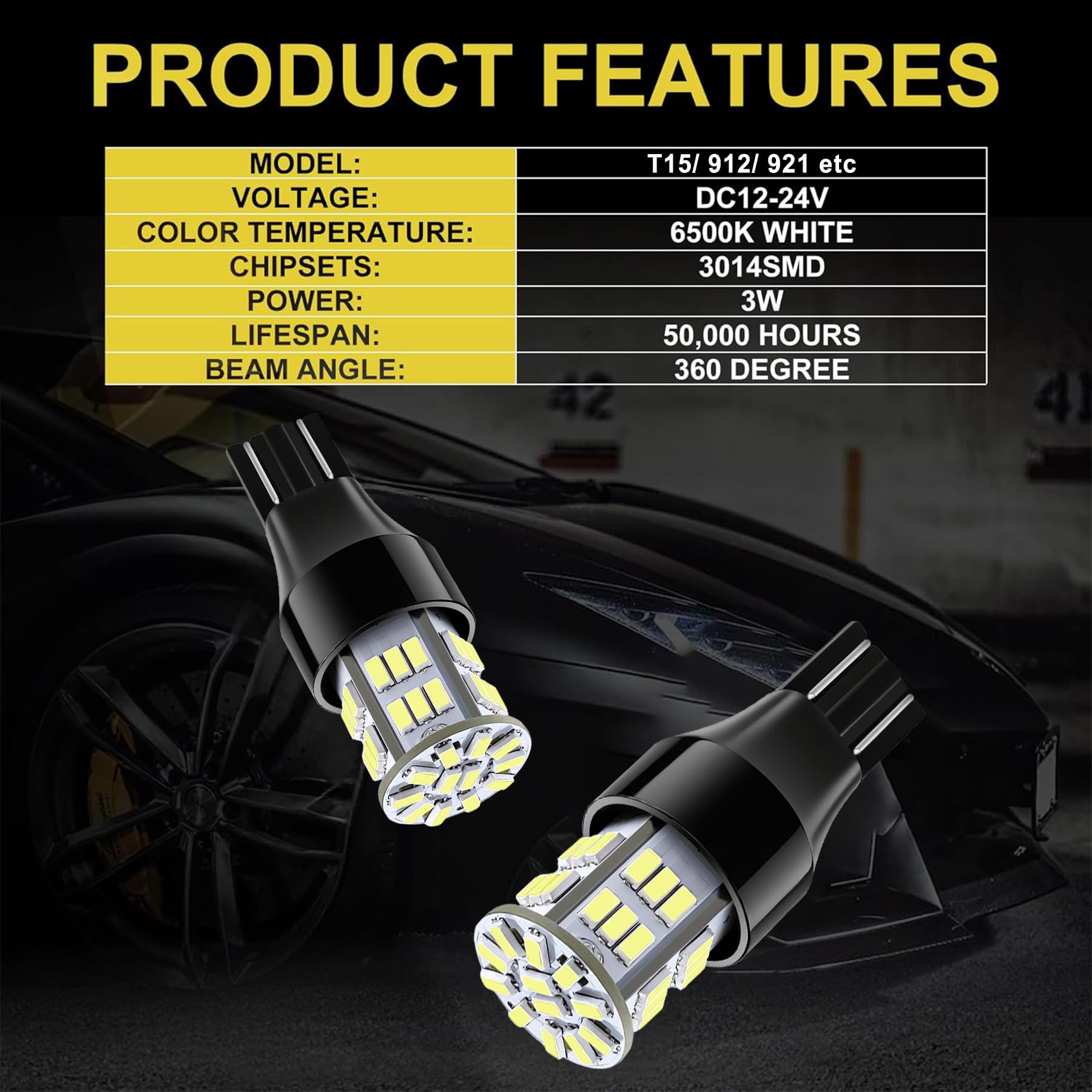 Key Specs: Voltage DC 12V-24V, 6500K Xenon White, Wattage 3w, low power consumption and fast heat dissipation for longer lifespan. The 912 led light bulbs are compatible with 921 T15 906 904 902 922 W16W etc.
