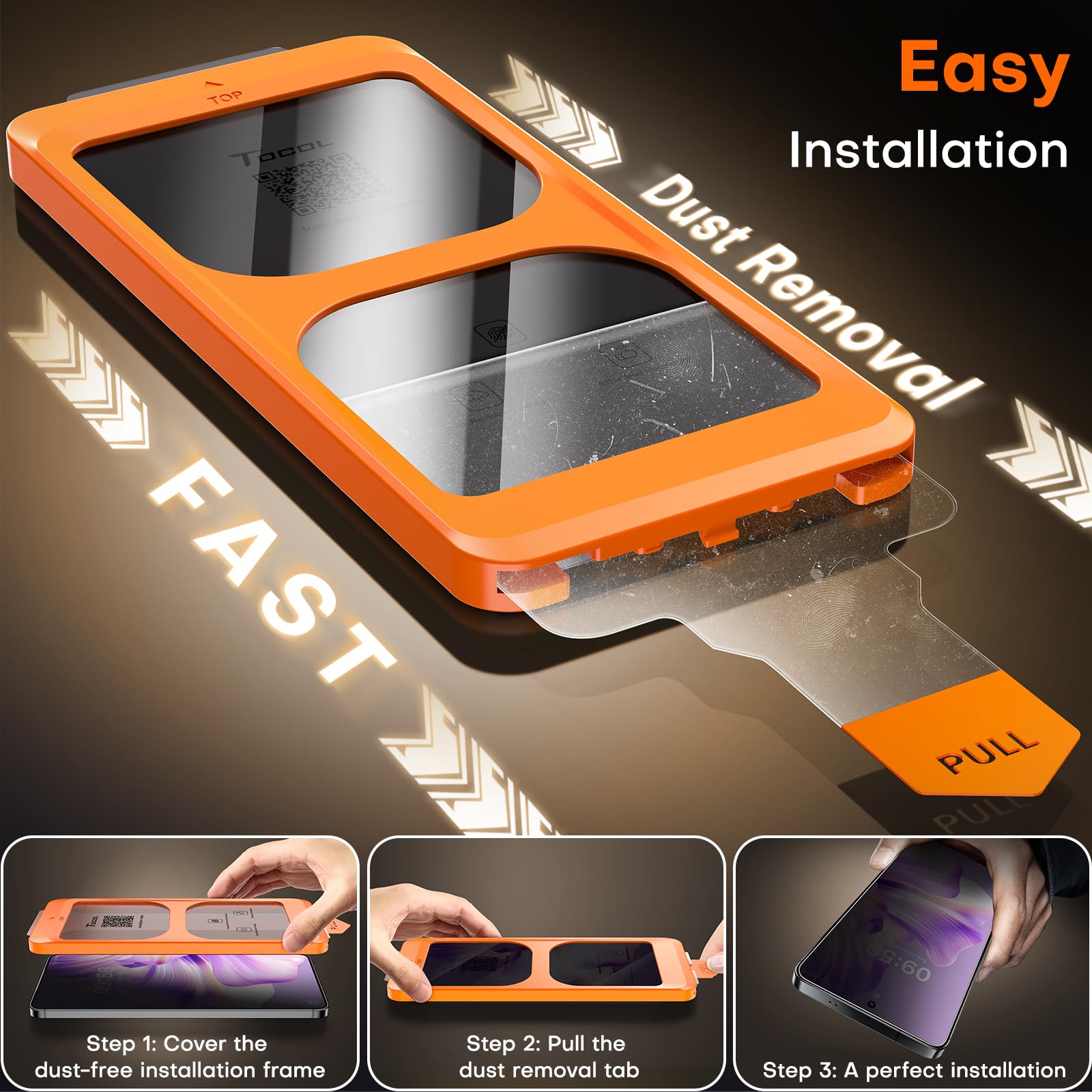 Revolutionary Innovative Auto Installation:This is the easiest method installing for Galaxy S26 privacy screen protector available on the market to date. It features innovative automatic positioning, dust removal, and adsorption technology, making the installation a breeze within seconds. Simply align the frame on your phone, press and pull. With a success rate as high as 99.99%