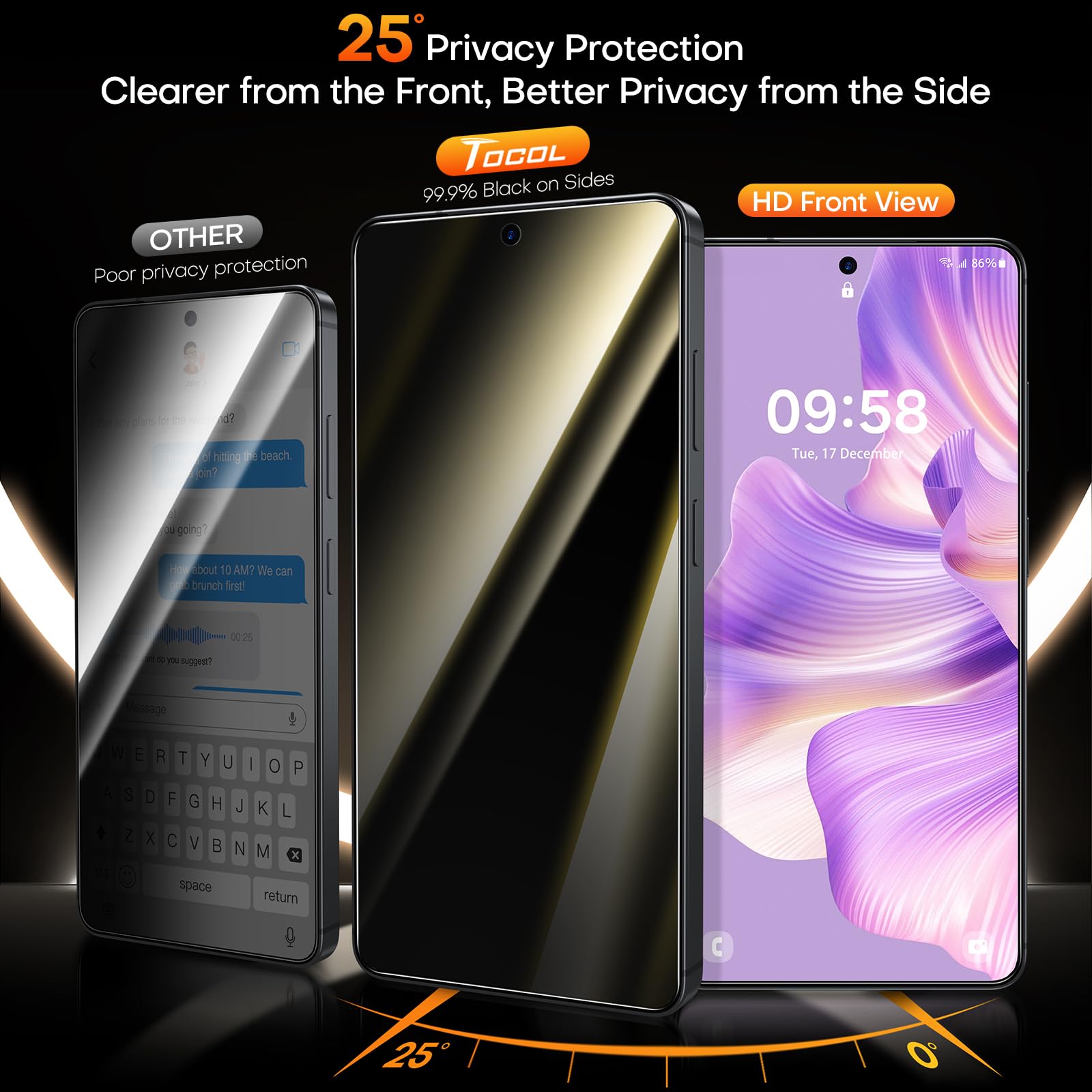 Excellent Privacy Protection:Only for Samsung Galaxy S26, achieve 25° super powerful privacy function. Protect your personal, private and sensitive from being seen by strangers in public buses, bank, subways, or any other public places. The screen is only visible to the person directly facing it