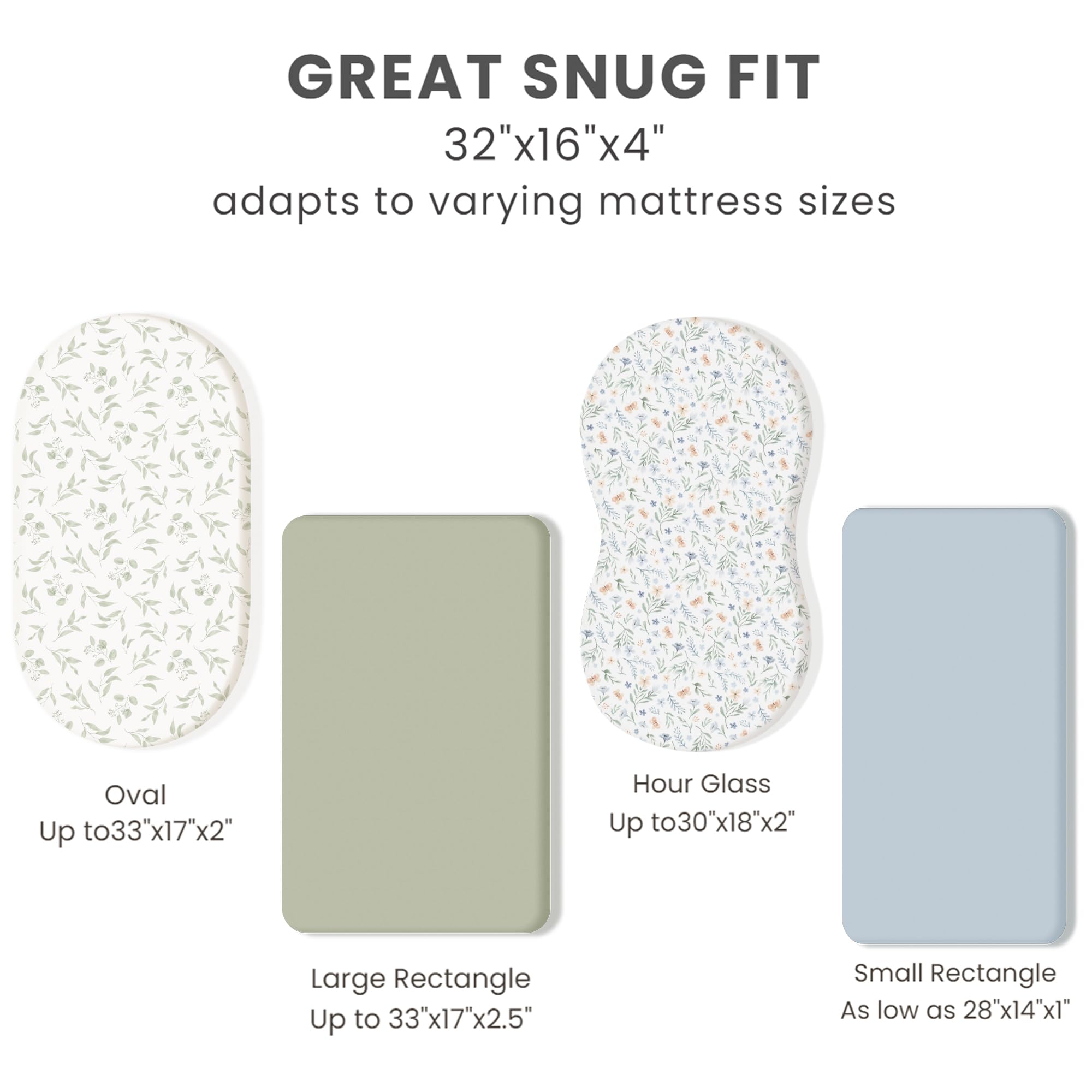 Universal Fit for Most Bassinet Mattresses: These bassinet mattress sheets (32" x 16") fit most bassinet mattresses, including oval, round, rectangle, and hourglass shapes. The elasticized edges provide a snug, secure fit for added safety