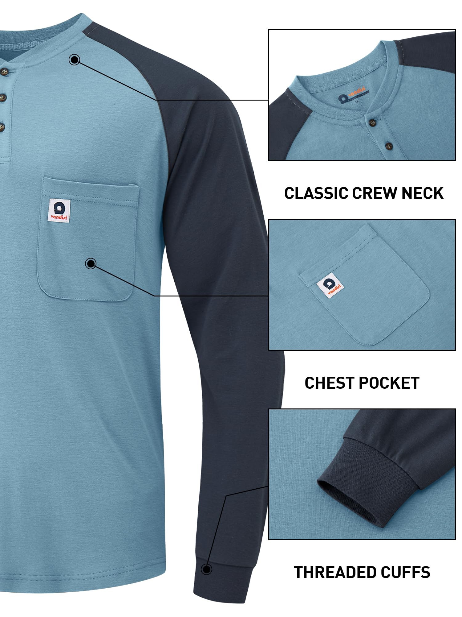 【Humanized Design】The Vandisi CAT 2 FR shirt features high-density seams and thermal transfer labels neckline for a true comfort experience. Henry collar and rib knit cuffs, enhanced fabric durability and stretch provide ease of movement and longer-lasting wear. Raglan sleeves significantly improve the fit of the shirt, 1 left chest pocket for great convenience!